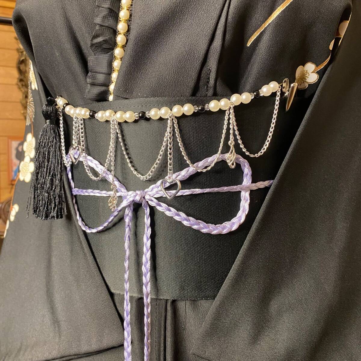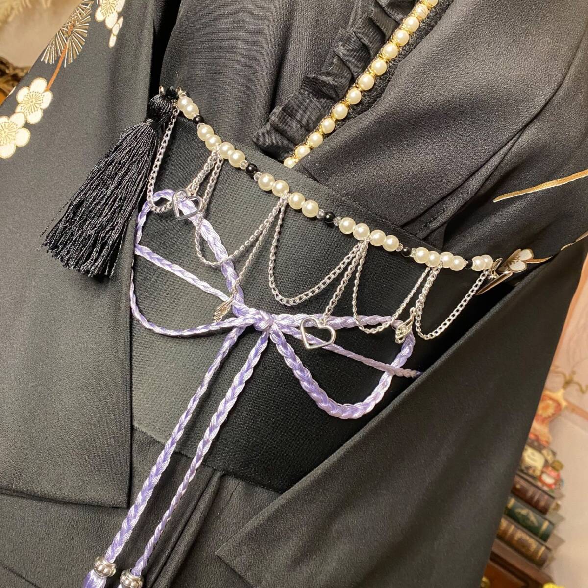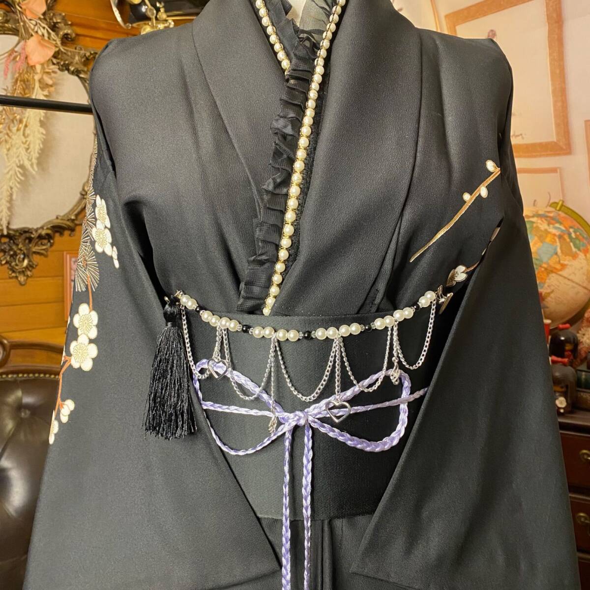 この帯飾りは、深く吸い込まれるような漆黒が特徴のオニキスと、気品あふれるパールビーズを組み合わせたシックなデザインです。オニキスは、魔除けや目標達成を助ける「成功の象徴」と言われており、その揺るぎない黒が、装い全体に静かな強さと洗練された知性をもたらします。