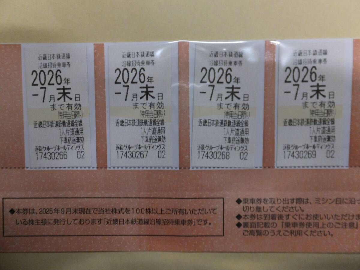 こちらは、近鉄株主優待乗車券 4枚 2026年7月末日まで有効です。