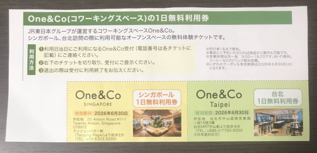 | JR東日本 株主優待券 One&Co(コワーキングスペース)の1日無料利用券です。 |