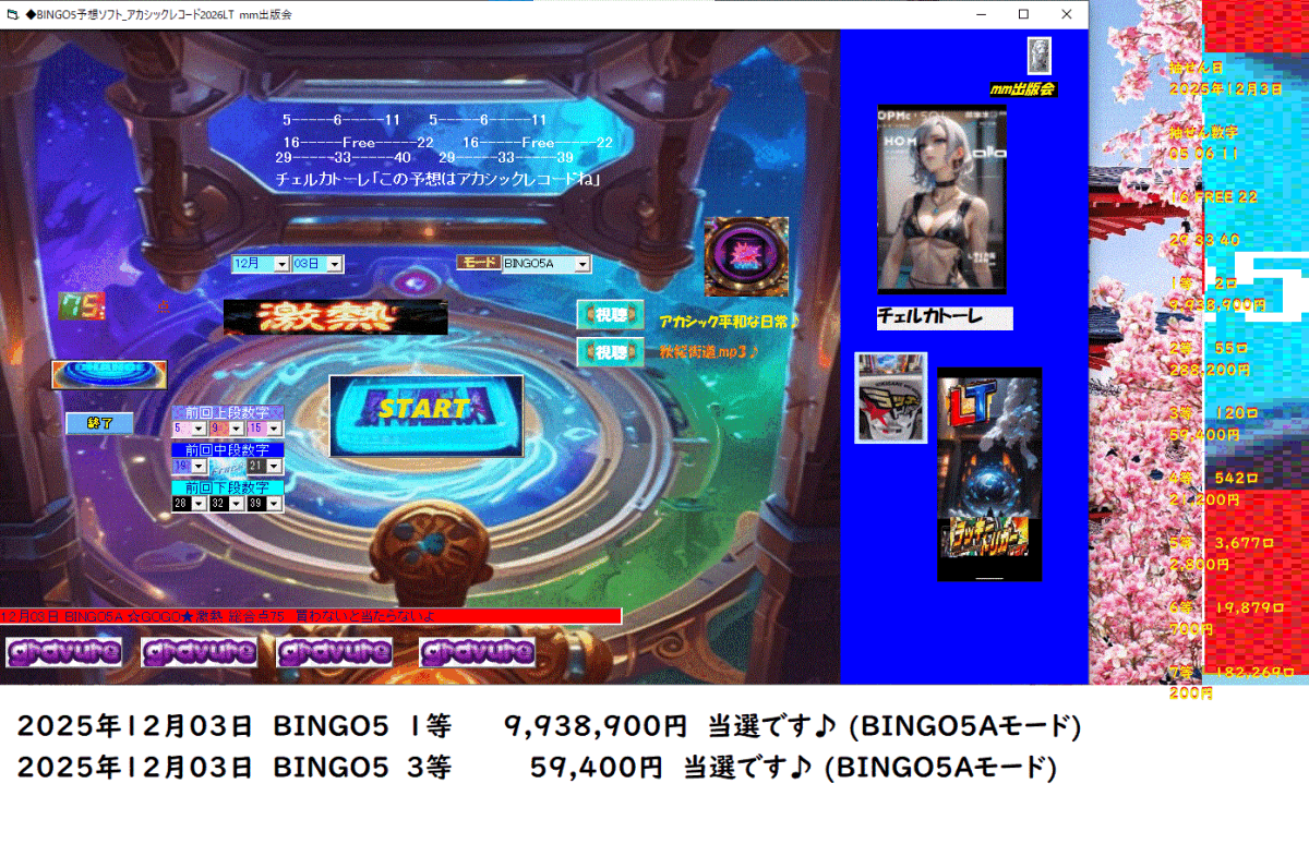 冬新作 [◆BINGO5予想ソフト_アカシックレコード2026LT] 2025年12月03日 BINGO5 1等 9,938,900円 当選です!、