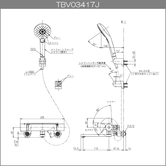 壁付サーモスタット混合栓 サーモシャワー アーチハンドル コンフォートウェーブ 3モード めっき TBV03417J TOTO GGシリーズ
