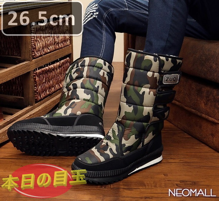 メンズ スノーシューズ 【866】 26.5cm グリーン迷彩 ムートンブーツ スニーカー ウィンターブーツ 裏起毛 防水 防寒 防滑 冬用靴 綿靴