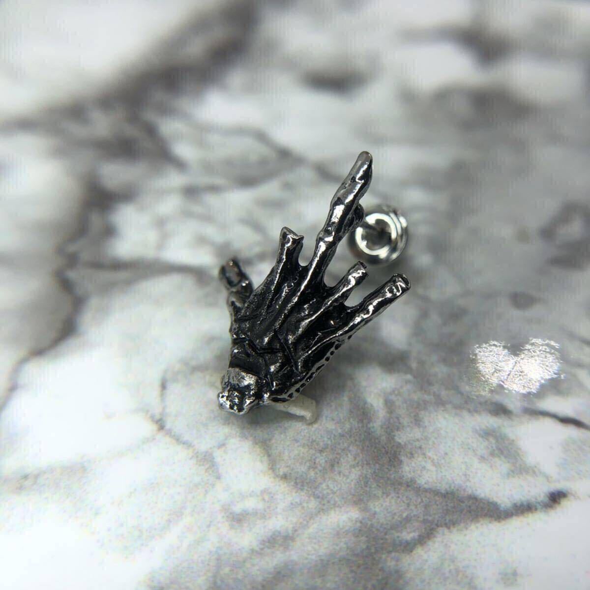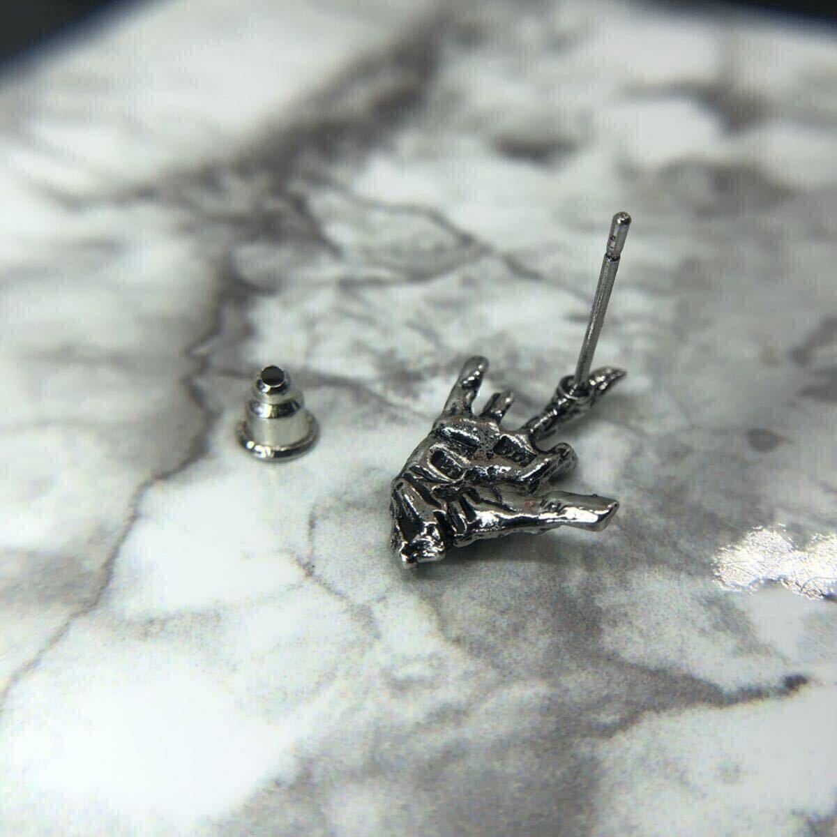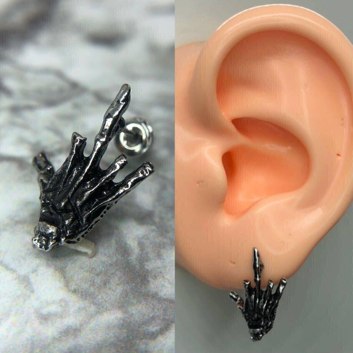 【新品】スタッド ピアス ハンド 手 中指 骸骨 ドクロ 民族模様 ブラック シルバー 片耳 メンズ 18g