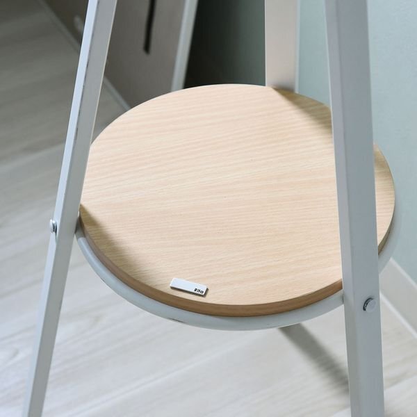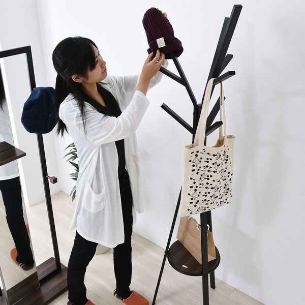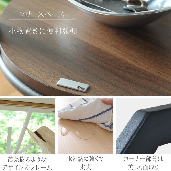 | Ritaシリーズは熱や水に強く、傷がつきにくいので、メンテナンスが容易です。 スチールは鋭角な部分を排除し、やさしい作りになっています。 真ん中に棚板を設置し、脚元にも収納スペースを確保しました。 ハンガー部は1本長くアシンメトリなデザインになっています。 お部屋に戻った際のコートや、鞄掛けに。デザインが、お部屋のアクセントになります。 |