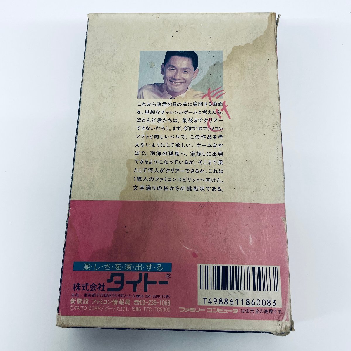 | 商品情報 タイトル名:たけしの挑戦状 メーカー:タイトー 商品状態 ソフト(表面):ランクB-小さな傷などのダメージはあるが使用には問題のない状態 ソフト(背面):ランクB-小さな傷などのダメージはあるが使用には問題のない状態 箱:ランクE-目立つ破れ・箱の耳が欠けているなど大きなダメージがある状態 説明書:ランクC-全体的に小さなダメージなどがある状態 起動確認:確認済み 管理番号:4007738 その他の状態は画像でご確認ください |