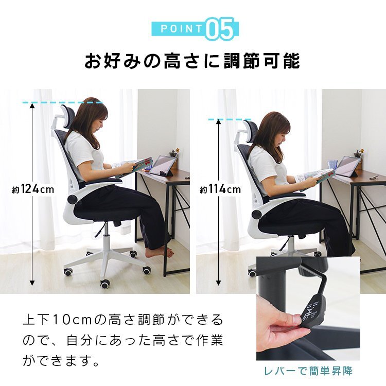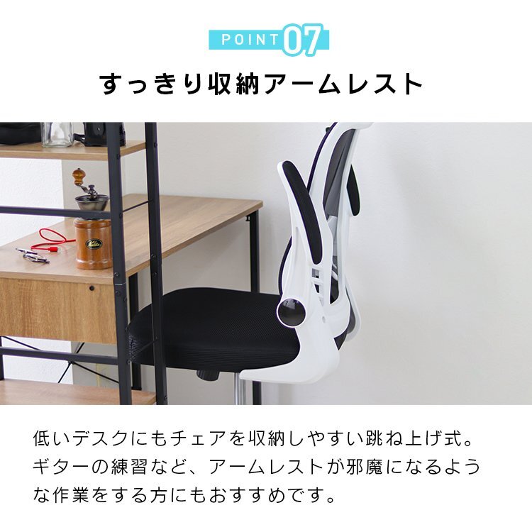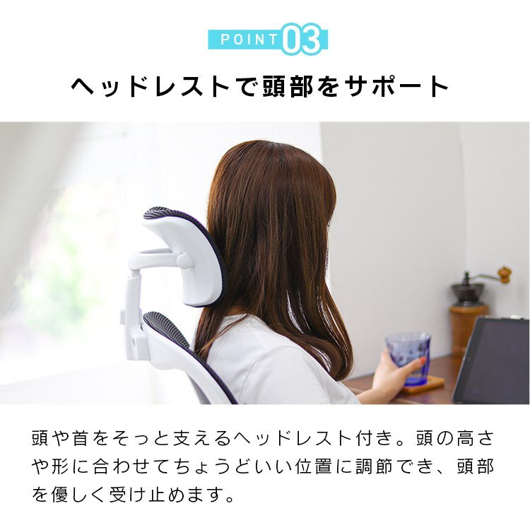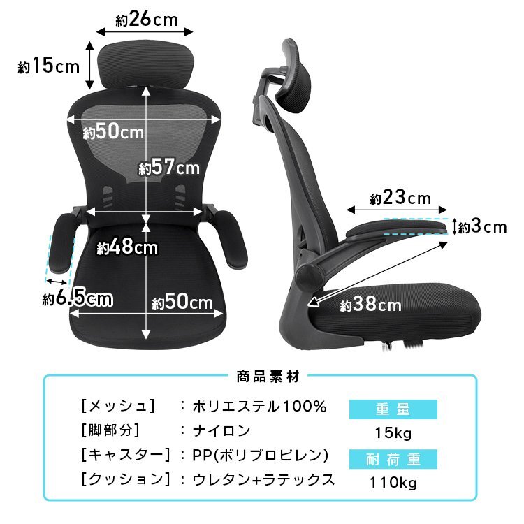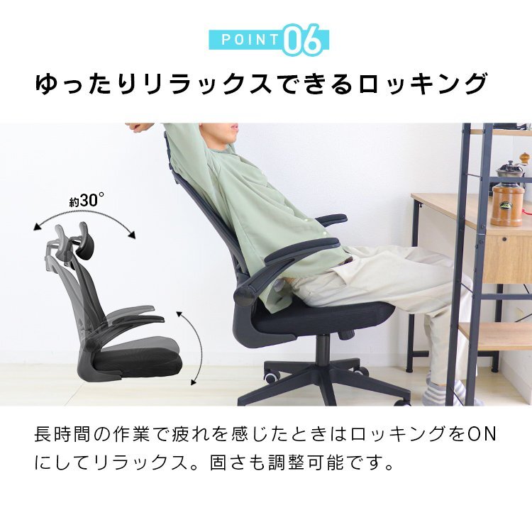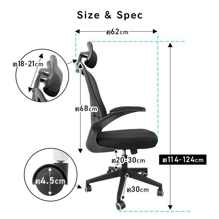背もたれと座面はメッシュ素材を使用。 通気性抜群で1年中、快適な座り心地を実現! 背中のカーブに沿ってフィットするS字構造! 腰・背中・肩全体の負担を軽減します。 頭や首を支えるヘッドレスト付。 頭の高さや形に合わせて位置調整可能。 アームレストは低いデスクでもチェアを収納しやすい跳ね上げ式! その他、ロッキング機能や360度回転など、多機能で使いやすさ抜群です♪ 【商品仕様】 カラー:ブラック 本体サイズ:(約)奥行62×高さ114~124cm 座面サイズ:(約)奥行48×幅45~50cm 重量:(約)15kg 耐荷重:(約)110kg 素材:ポリエステル100%、ナイロン、PP 他 【注意事項】 ・お客様組立の商品です。 ・商品は、モニターによって色合いが異なって見える場合があります。 ・仕様/デザインは改良のため予告なく変更することがあります。 |