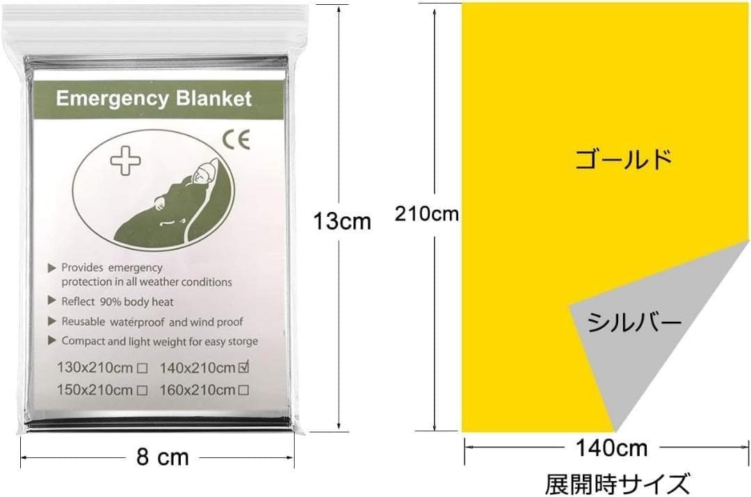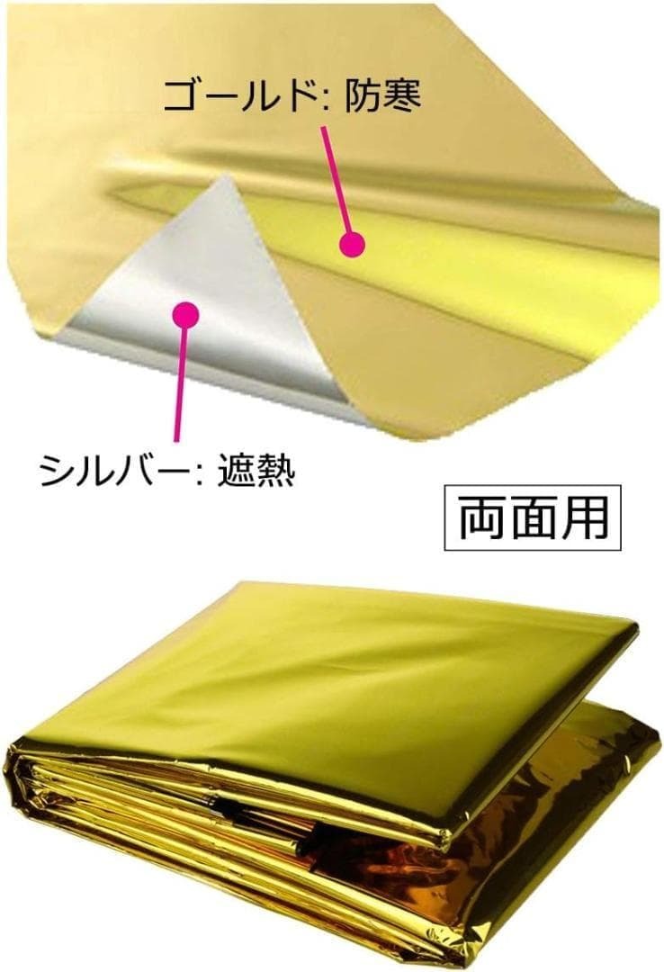 (6枚組)エマージェンシーシート アルミシート 防災, サバイバルシート コンパクト (防寒/保温/遮熱), 災害、キャンプ、登山時 防寒対策 ゴールド + シルバー/140cm×210cm 【仕様】 サイズ: 140×210cm,厚さ: 12ミクロン. パッケージサイズ: 14×8.0×2.5mm. 重量 : 60g .コンパクト・軽量なので、かばんや防災リュック、車の中などに常備できて、持ち運びラクラクです! 【防寒/遮熱機能】 素材 : ゴールド/シルバー のリバーシブル アルミ・PET. 金色は熱を吸収し、銀色は熱を反射する性質が有ります。炎天下では銀色側を外側に向けると防暑断熱してくれます、寒いときは金色を外側に体を包むだけで、体温の放熱を防いでくれます。 【光りを反射】表面が光りやすい素材のため、山岳などでの遭難時には目印にもなる、救助者に信号を送る反射フィルムとして位置を知らせます。ヘリからの視認性もよく、SOS救難信号に使えます。 amazon価格 ¥1,399 税込 新品未使用なので動作確認していません。 故障の際はメーカーに問合せしてください。 またすり替え防止のため返品は受け付けておりません。 ご了承の上ご購入くださいませ。 即日発送。 開封痕、使用痕等がある場合がございます。 外箱の破損や多少のビニールの破れ等は不問としております。 本商品は訳あり商品となっているため、箱が潰れている可能性がございます。 通常の新品を購入するよりもお得となっておりますので、お見逃しなく フォロー+商品購入希望コメントで100円お値引き 1000円以下の商品は送料分の売上が残らないこともあるので50円引きとなります 商品のデザインや色、状態には主観を伴い表現及び受け止め方に個人差がございます 保管上または梱包でのシワはご了承ください 商品説明と一部相違がある可能性があります。 購入後のクレームは対応しかねますので上記をしっかりとご理解いした上でのご購入をお願いします。 管理用箱番号【338】 |