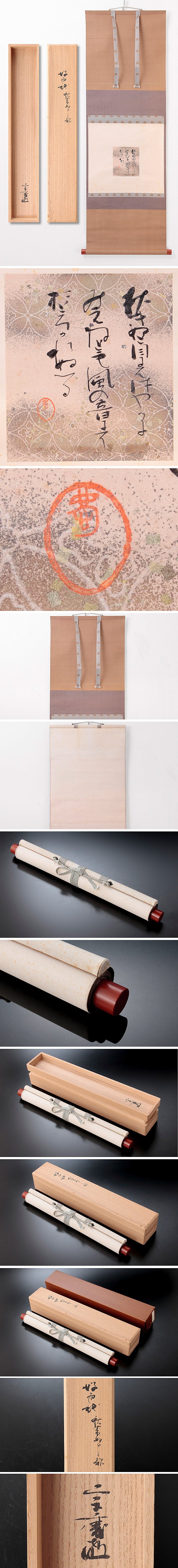 流れる様な筆使い、気品が溢れる作品、紙面は小さいですが大きな世界が広がります。 秋来ぬと 目にはさやかに 見えねども 風の音にぞ おどろかれぬる (読み方:あききぬと めにはさやかに みえねども かぜのおとにぞ おどろかれぬる) 意味 「秋が来たと、目にははっきりとは見えないけれど、爽やかな風の音で(秋の訪れに)はっと気付かされたことです。」 ★商品は小堀宗慶の作品である事を保証致します。 ※掛軸の同梱発送について※ 掛軸とお茶碗などの茶道具との同梱は、破損の危険性が非常に高いため、基本的に承っておりません。予めご了承下さいますようお願い申し上げます。掛軸同士やその他形状が近い商品に関しては同梱可能な場合もございますので、その際は当店よりお知らせ致します。 |