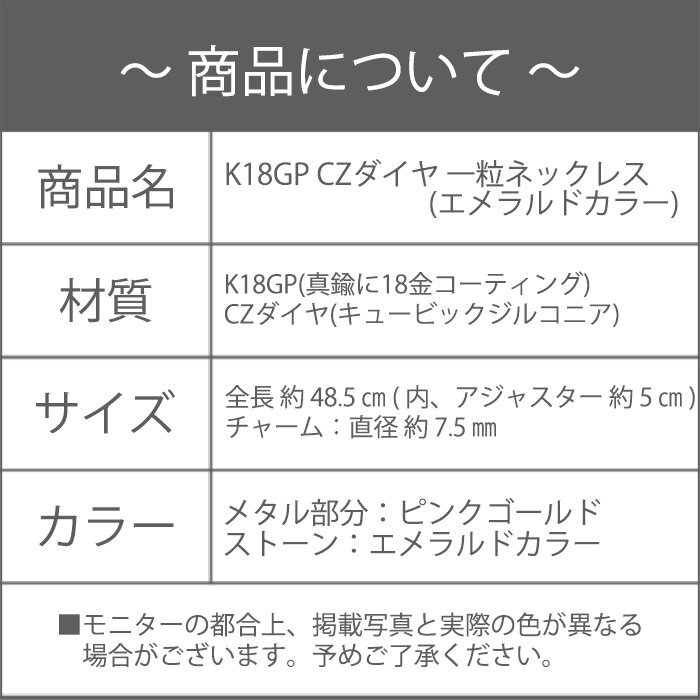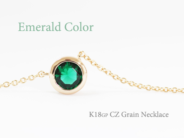 ネックレス レディース 一粒 エメラルド カラー ピンクゴールド 18金 18kコーティング シンプル 上品 女性/ K18GP CZダイヤ 一粒ネックレス