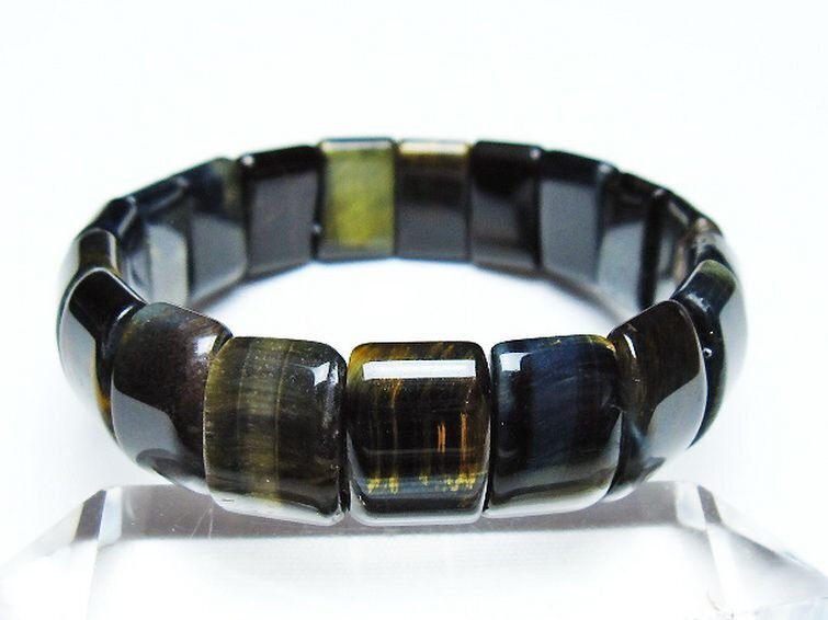 | ■商品名: ブルータイガーアイ※青虎目石バングル ■商品ID: T173-5077 ■商品重量:約 36.2g ■商品サイズ: 高約:15mm 横約:11mm 厚約:6mm 内径円周約:158mm(±5mm) 【タイガーアイ(虎目石)】 タイガーアイは角閃石の一種のクロシドライト(青石綿)に石英が染み込んで酸化し、茶色や黄金色になったものです。 研磨すると光の当たり具合によってキャッツアイ効果、またはシャトヤンシー効果と呼ばれる猫の目のような光の筋が見られ、その輝きと黄金色と褐色の縞模様が虎の眼に見えることからこの名前が付けられました。 ベーシックな金茶色の他にも様々な色合いがあり、温度が高い環境で生成されると深い赤みを帯びたレッドタイガーアイになります。 この他にクロシドライトが酸化せずに生成された灰色のグレータイガーアイは「ウルフズアイ(狼目石)」、濃青色をしたブルータイガーアイは「ホークアイ(鷹目石)」と呼ばれ、タイガーアイとは区別される場合があります。 タイガーアイは視野を広げ正しい判断力と行動力で成功へ導くとされ、ルチルクォーツに匹敵するほどの金運・仕事運アップストーンとして高い知名度と人気を誇っています。 また男性イメージの強い石ではありますが、強力な邪気払い・トラブル回避の効果も持ち合わせていますので女性にはストーカーやセクハラ対策のお守りとしても有用です。 ⇒ タイガーアイをもっと詳しく ◆ワンポイント情報 タイガーアイは塩分によって劣化しやすいので汗が付いた場合は柔らかい布で拭き取るようにし、塩を用いた浄化は行わないように注意しましょう。 |