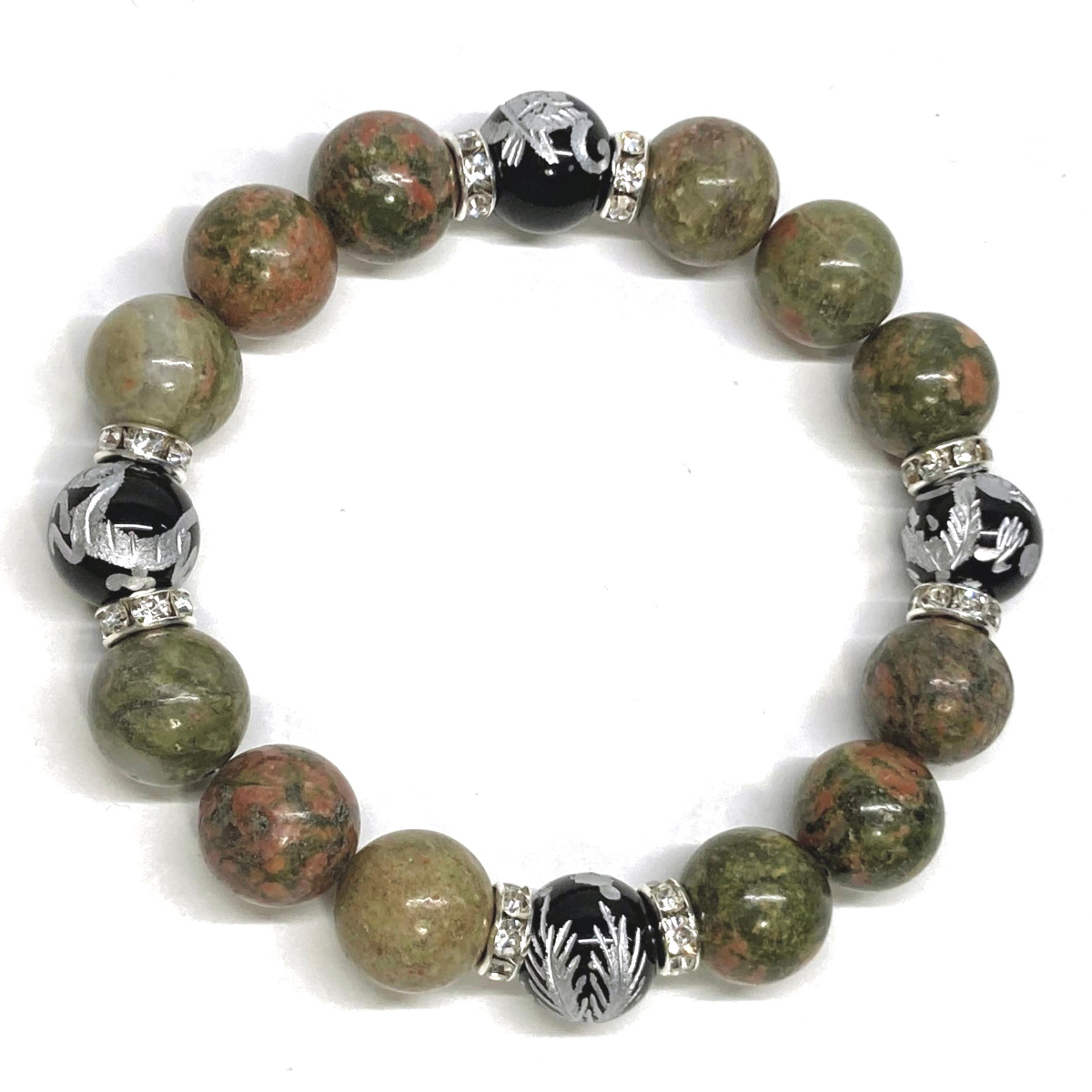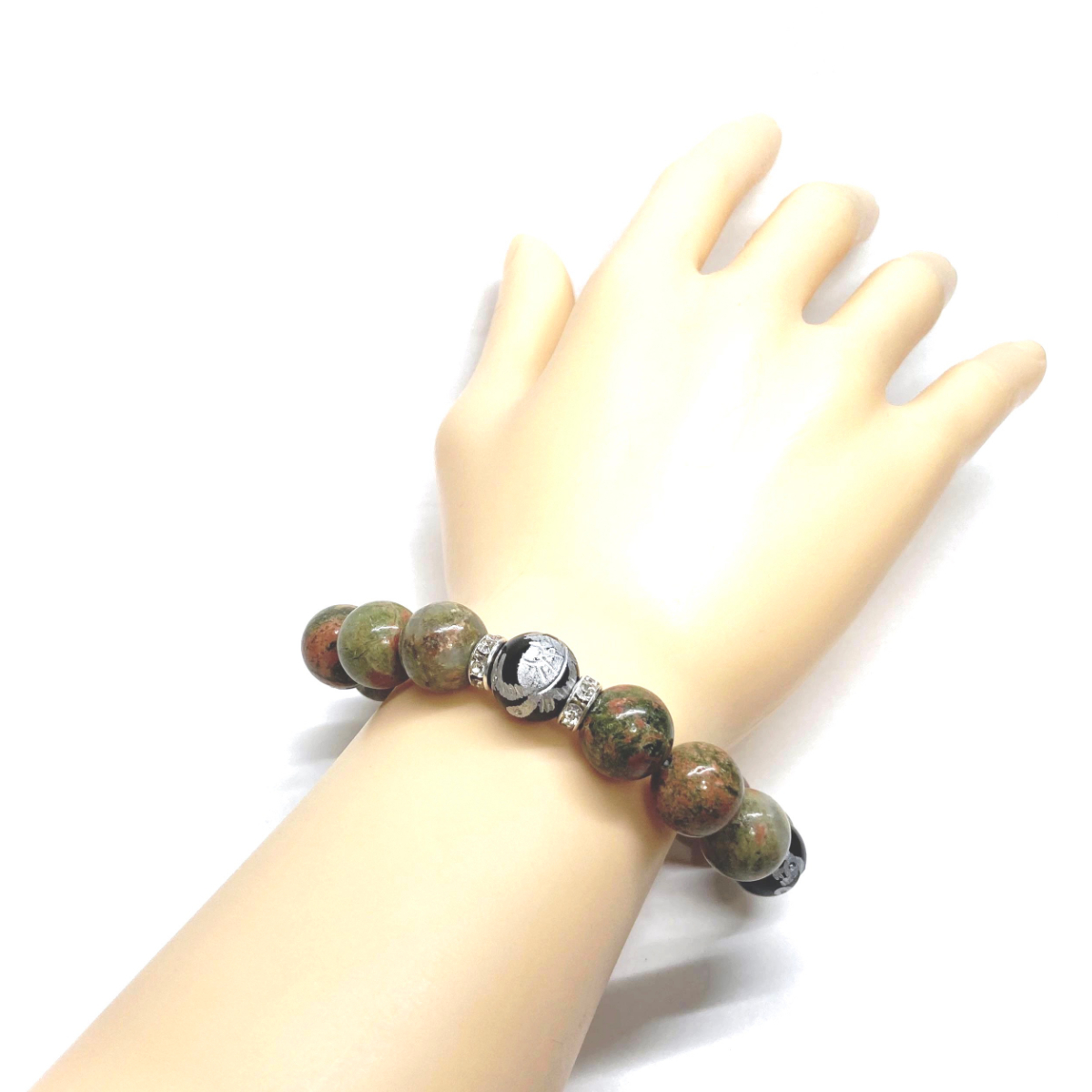 こちらは、四神獣銀彫オニキとユナカイトを組み合わせたパワーストーンブレスレットです。四神獣は、中国の伝説で4つの方向(東西南北)を守護する神聖な神。四神獣、厄災から身を守り、多くの運気を呼び込むと言われております。石大きさは程よくインパクトのある12mm玉で内周 約17cmです。 数に限りがございますので気になる方はお早めにどうぞ。
