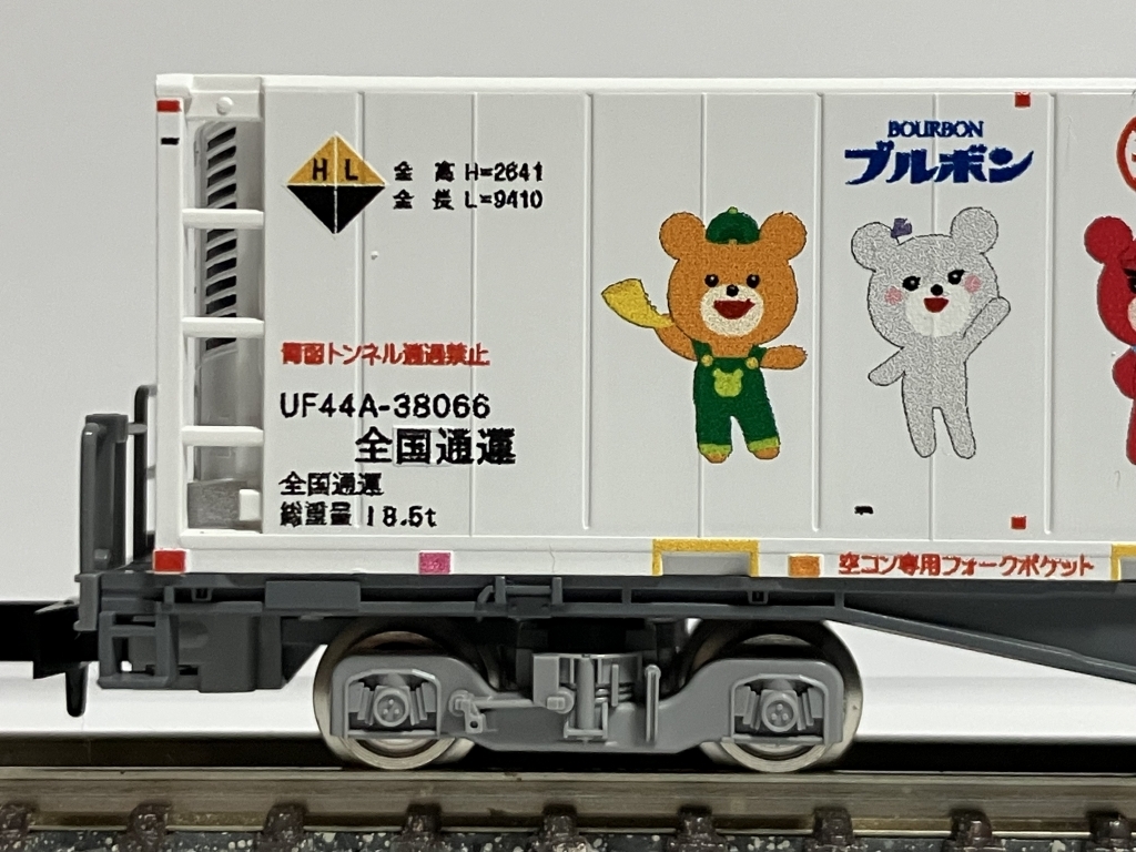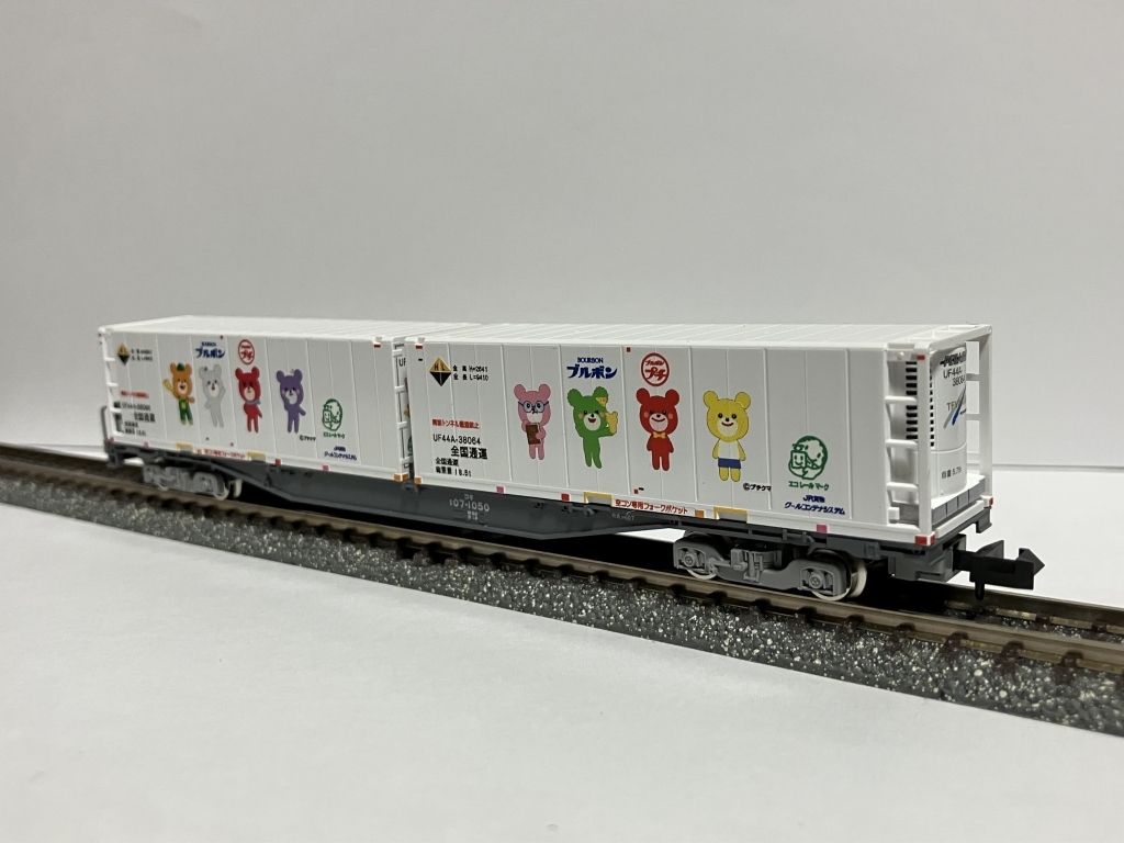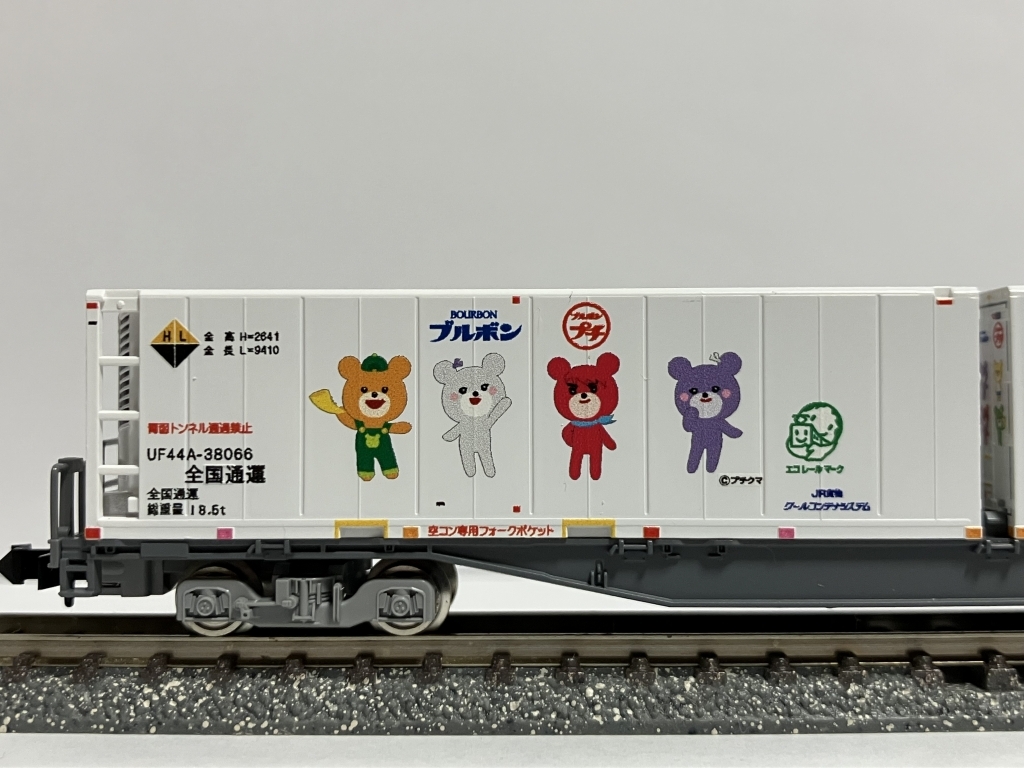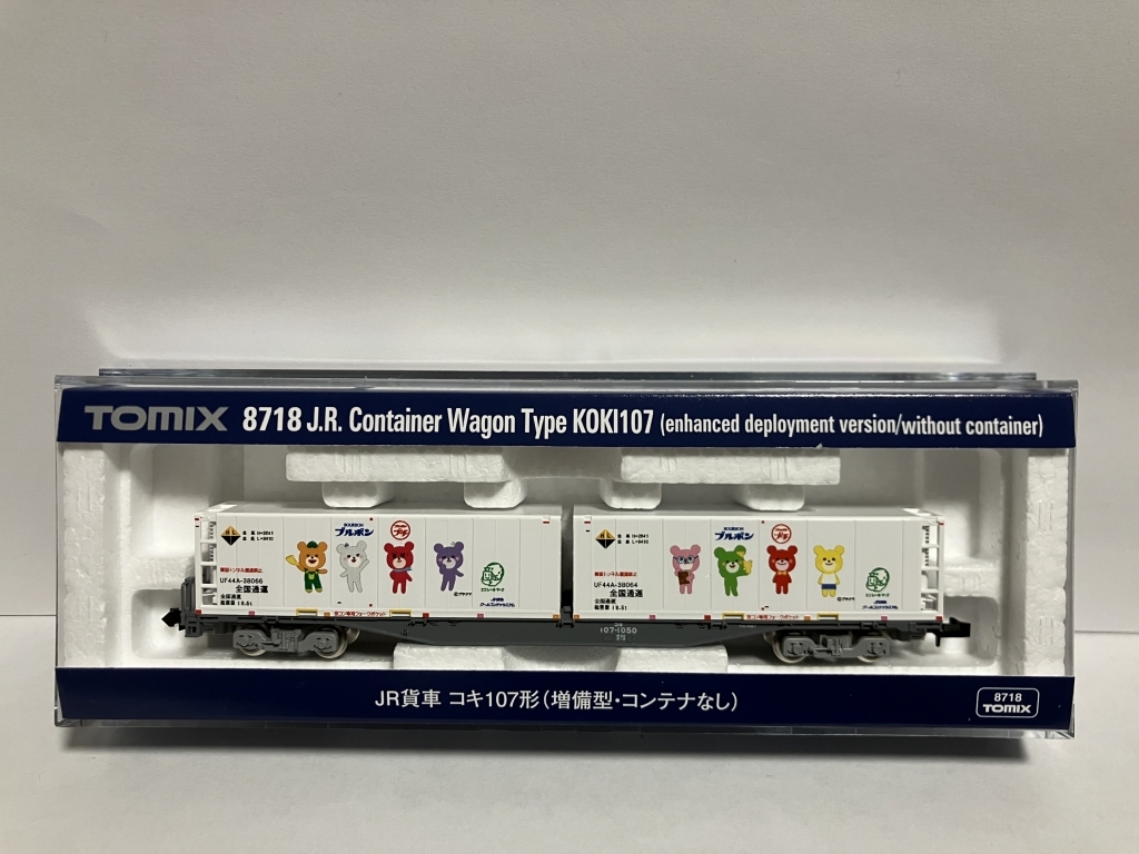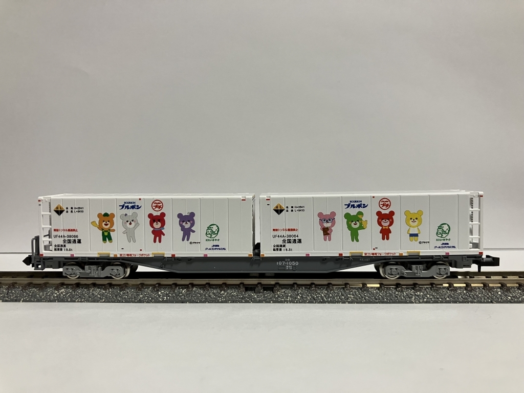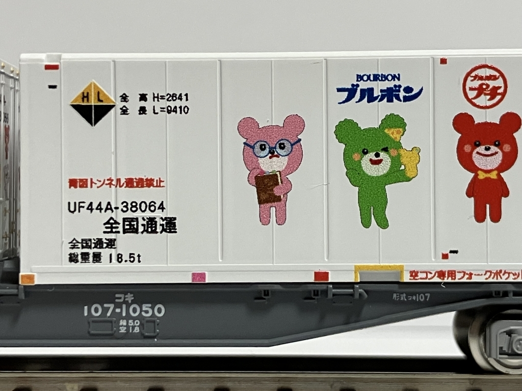 TOMIXのコキ107-1050貨車にHOGARAKADOUの品番FA-3102 全国通運ブルボンプチクマUF44A-38064UF44A--38066コンテナを搭載しました。トミックスのクリアケースに入れています。品名記載の紺色シートの内容とは一致しませんので了承お願いします。送料は、定形外郵便で390円。追跡付きはゆうパケットプラス440円です。新品 未走行です。