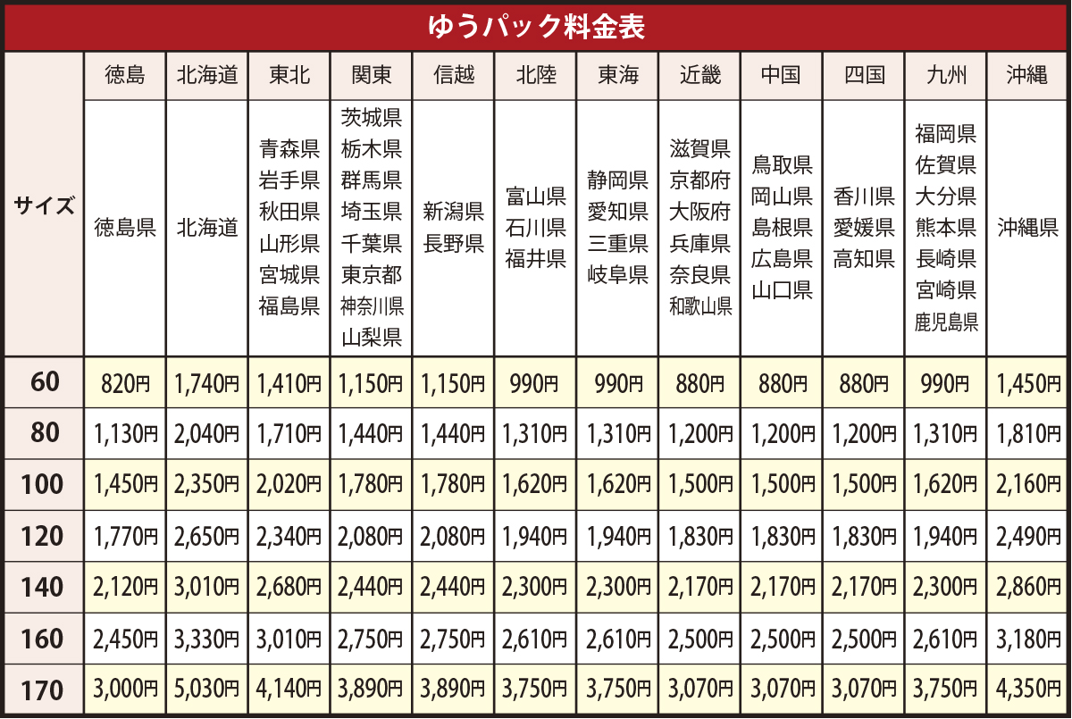 | 発送方法 | ■ゆうパック ※配送料金は下記を参照してください。 ※発送サイズは下記表の【60】になります。 |