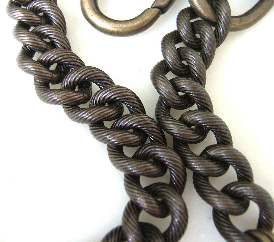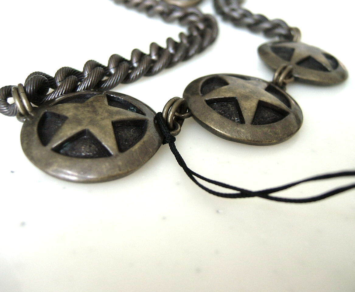 ■ 3枚のドーム型に膨らみを持たせた星スター柄入りコインモチーフを連結させて3連としデザインアクセントとしています チェーン自体にも細やかに柄彫り装飾がされており凝っています