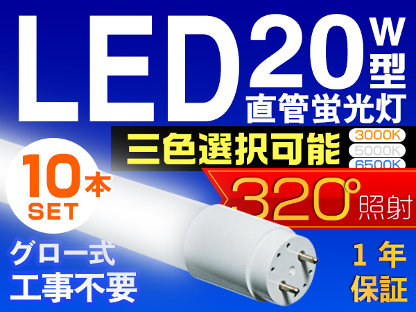 10本セット LED蛍光灯 20W型 直管 SMD 58cm 昼光色or3色選択 LEDライト 1年保証付 グロー式工事不要 320°広配光 送料無料 PCS