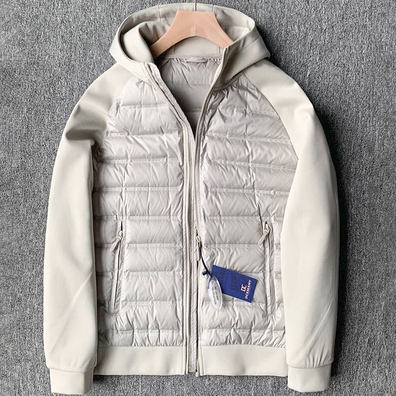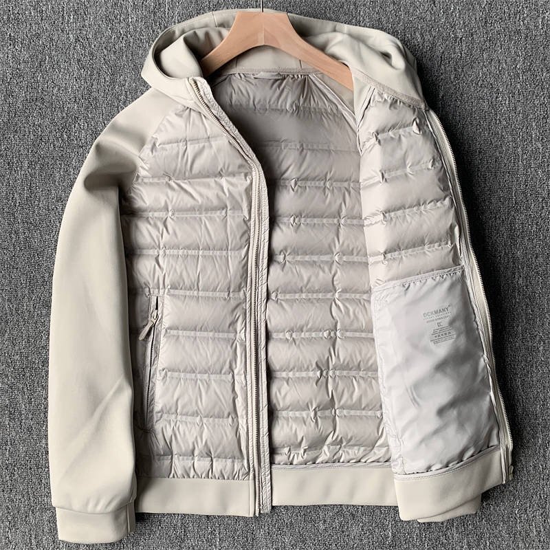 新品 DCKMANY ダウンジャケット ゴルフジャケット フード付き 切り替えスリーブ 秋 冬 軽量 暖か シームレスダウン 冬服 保温 メンズ ダウンアウター ベージュ E541-3XL