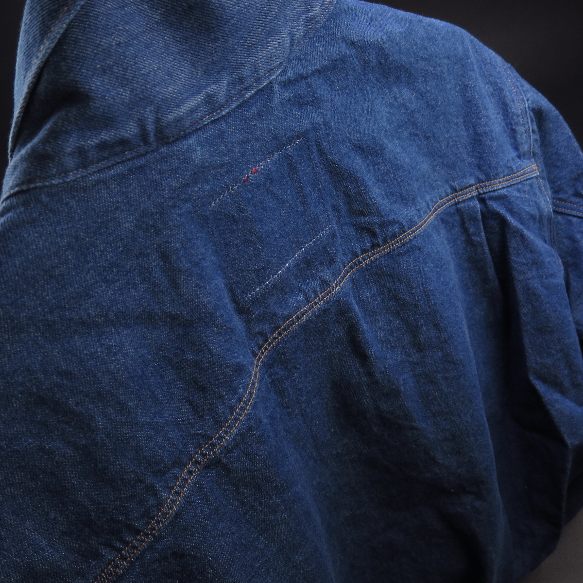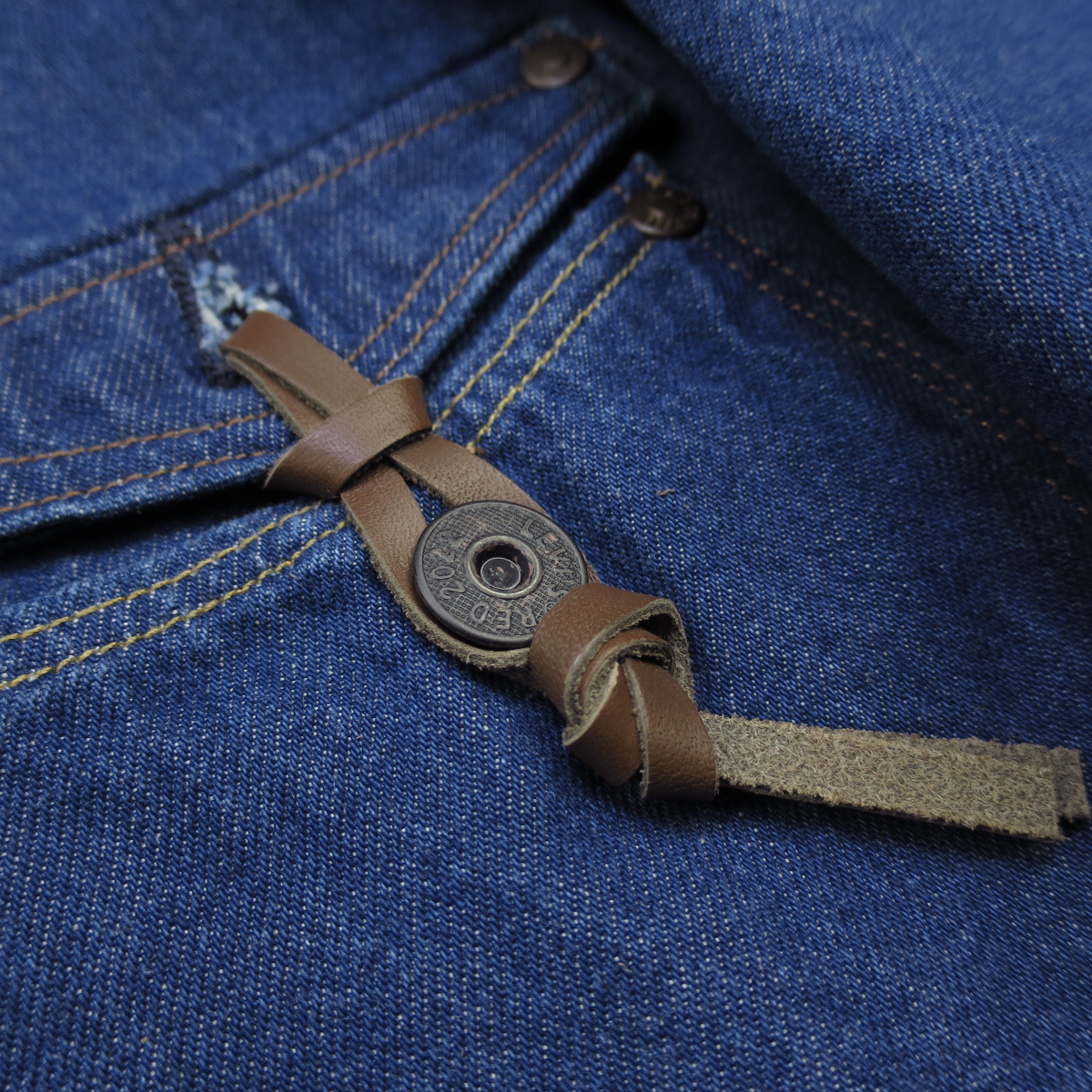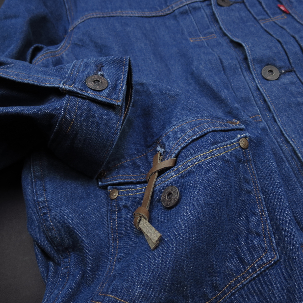 ■このヴィンテージ風のジャケットは、ユニークなプリーツのディテールと2フラップポケットのデザインで知られるLevi's Type II トラッカージャケットのシルエットを落とし込んでいます。 ■不規則なフォントのスペードポケットはレザーの留め具付き。 ■オリジナルのスタイルに忠実に、フロント前立ての両脇にプリーツのディテール不や規則なオフキルターステッチを施しているのが特徴です。 |