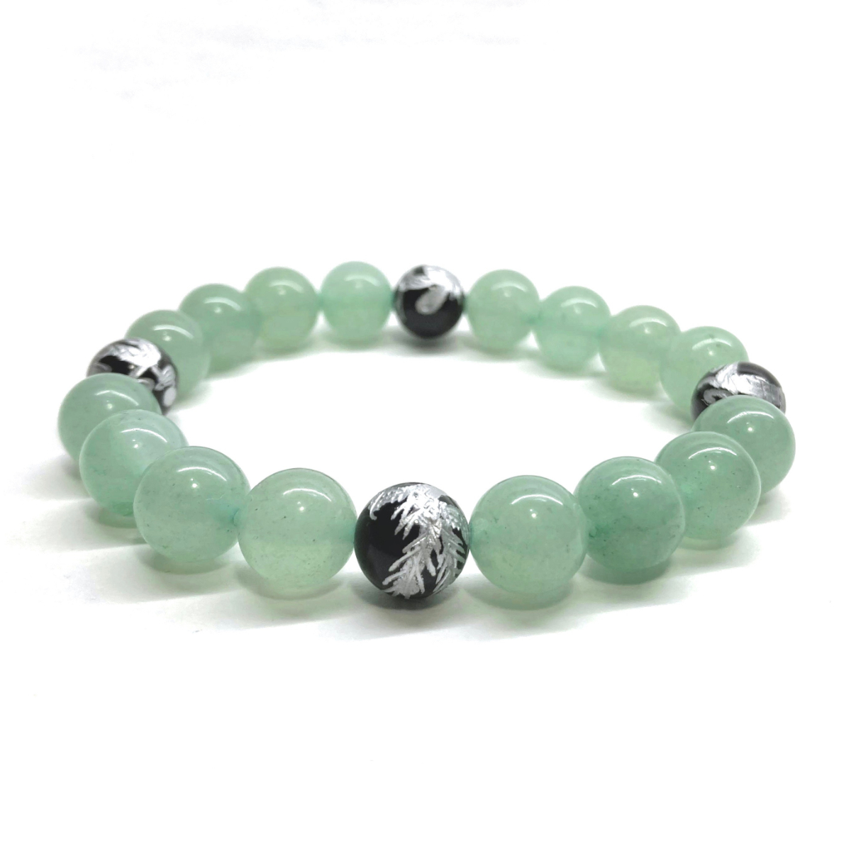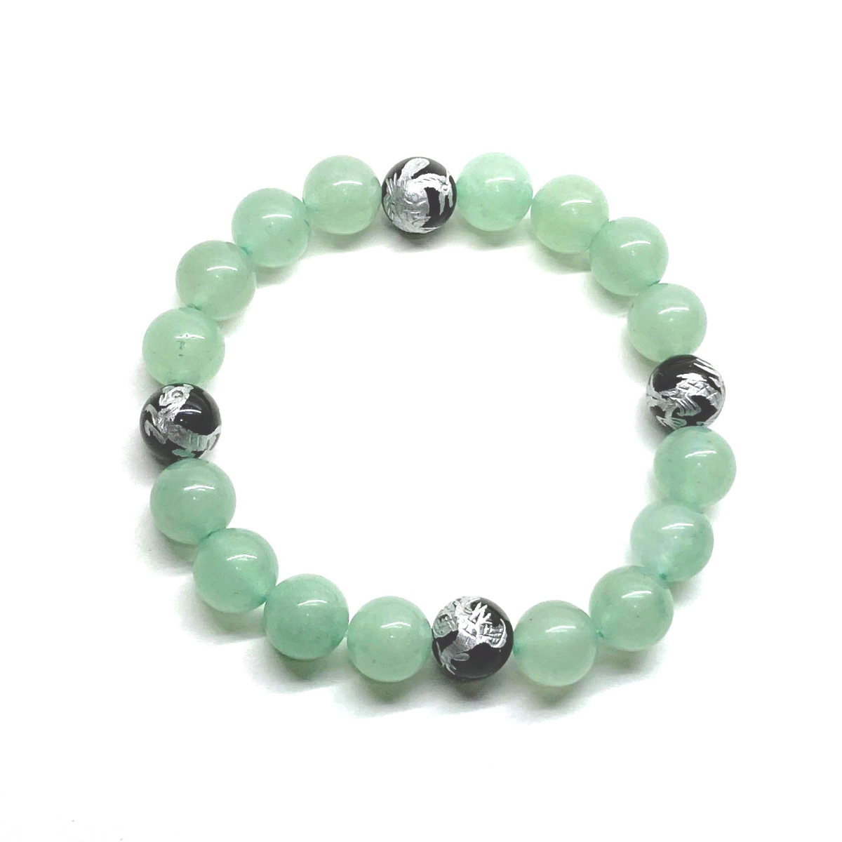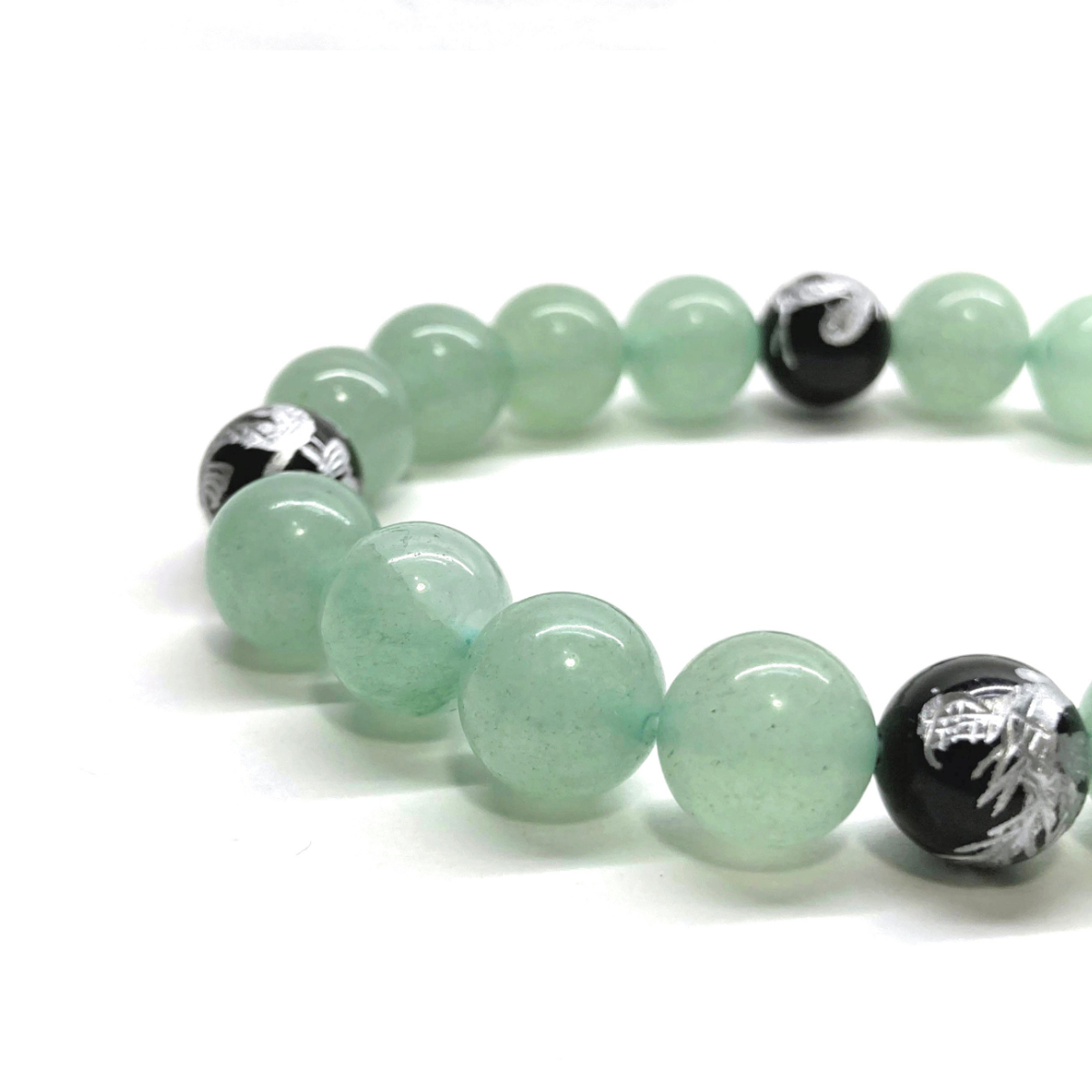こちらは、四神獣銀彫オニキスとアベンチュリンを組み合わせたパワーストーンブレスレットです。四神獣は、中国の伝説で4つの方向(東西南北)を守護する神聖な神。四神獣、厄災から身を守り、多くの運気を呼び込むと言われております。石大きさは程よくインパクトのある10mm玉で内周 約17cmです。 数に限りがございますので気になる方はお早めにどうぞ。