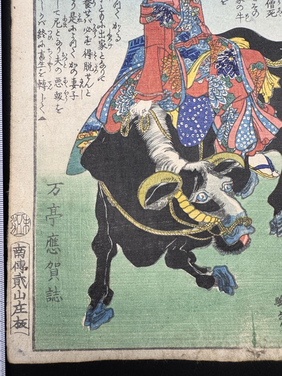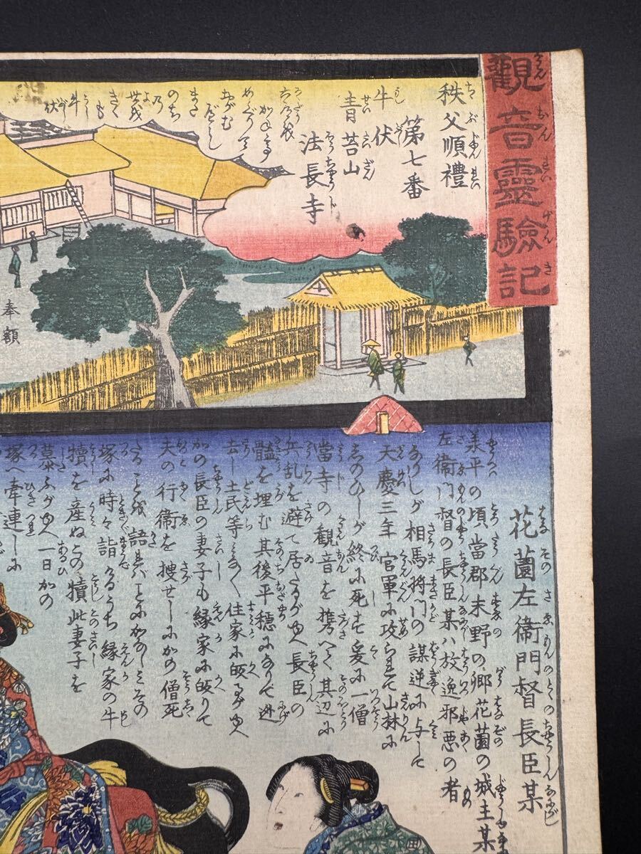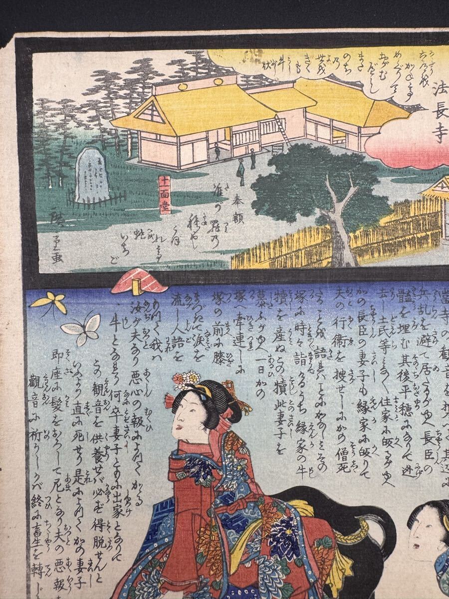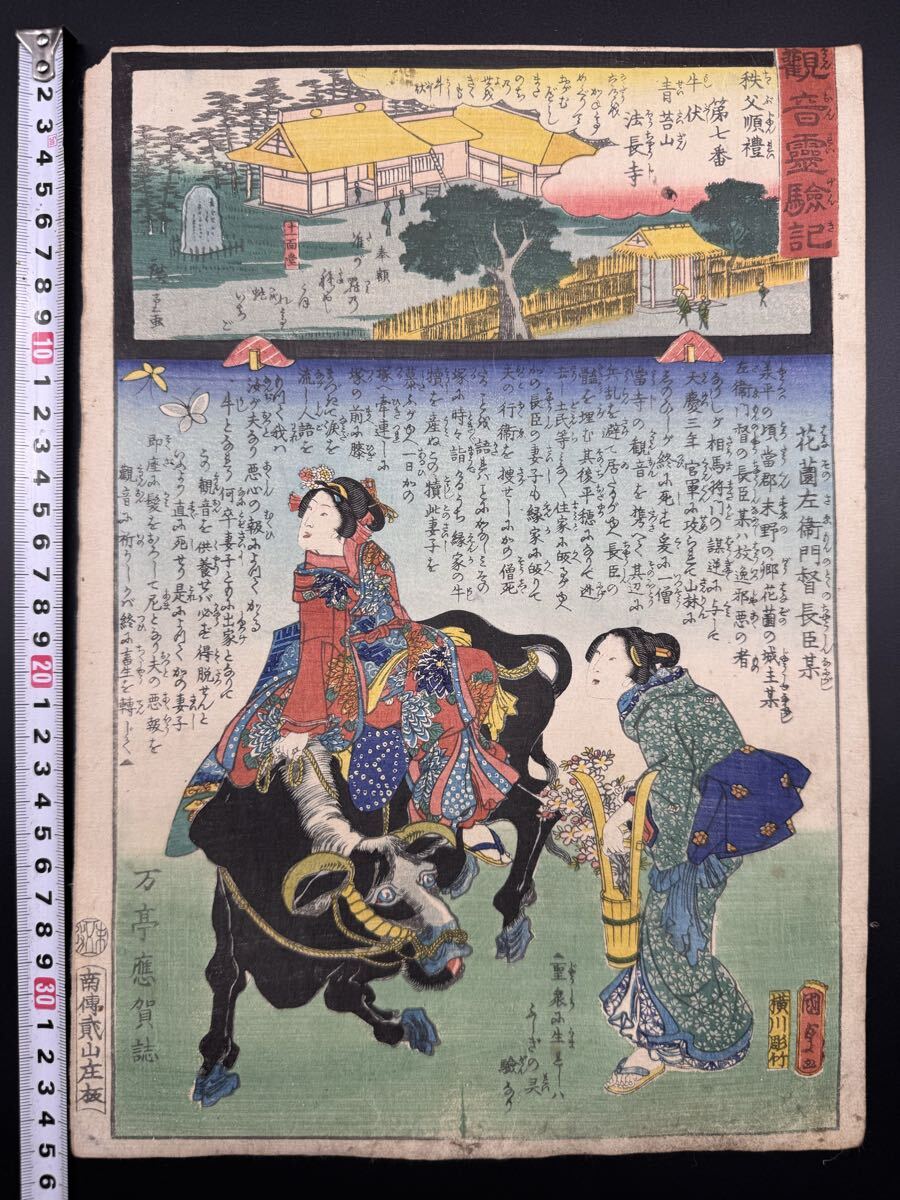 【真作】本物浮世絵木版画 三代歌川豊国/二代歌川広重「観音霊験記 秩父順礼 牛伏青苔山法長寺」江戸期 名所絵 大判 錦絵 保存良い 裏打ち
