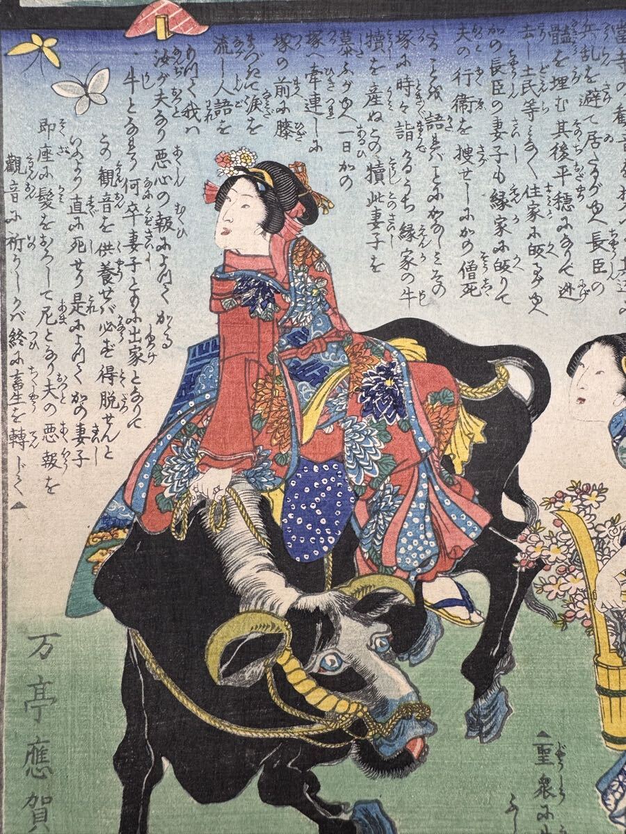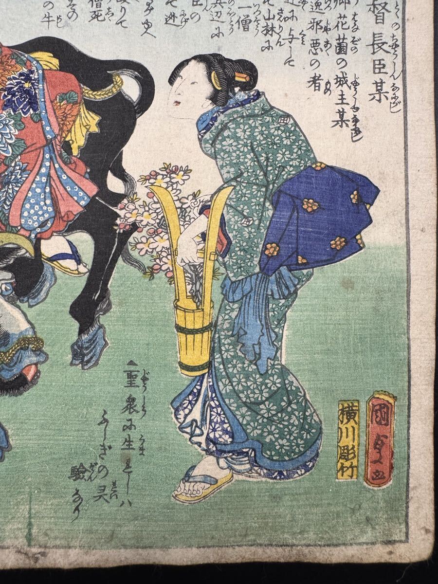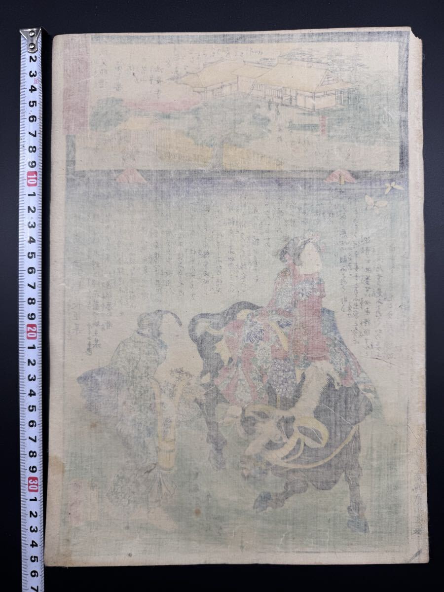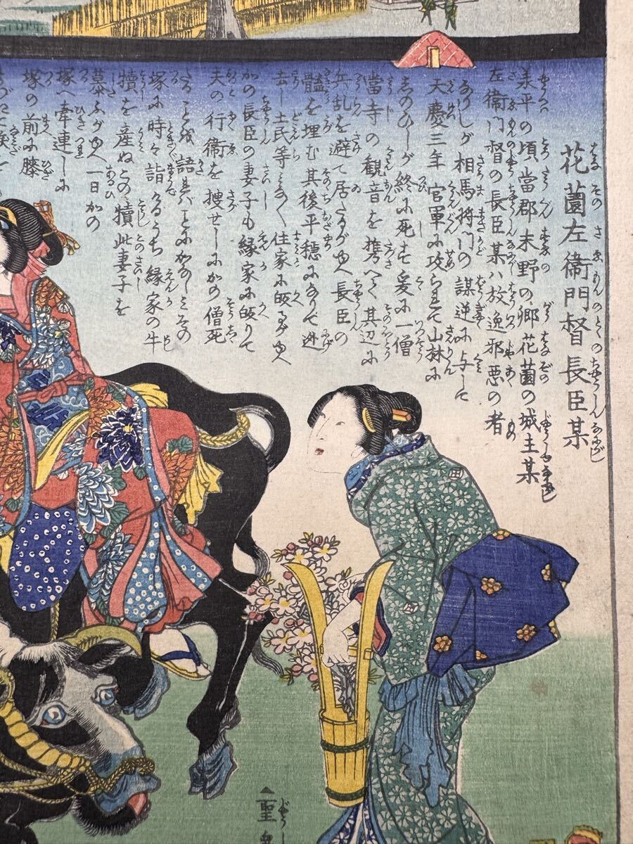 【真作】本物浮世絵木版画 三代歌川豊国/二代歌川広重「観音霊験記 秩父順礼 牛伏青苔山法長寺」江戸期 名所絵 大判 錦絵 保存良い 裏打ち