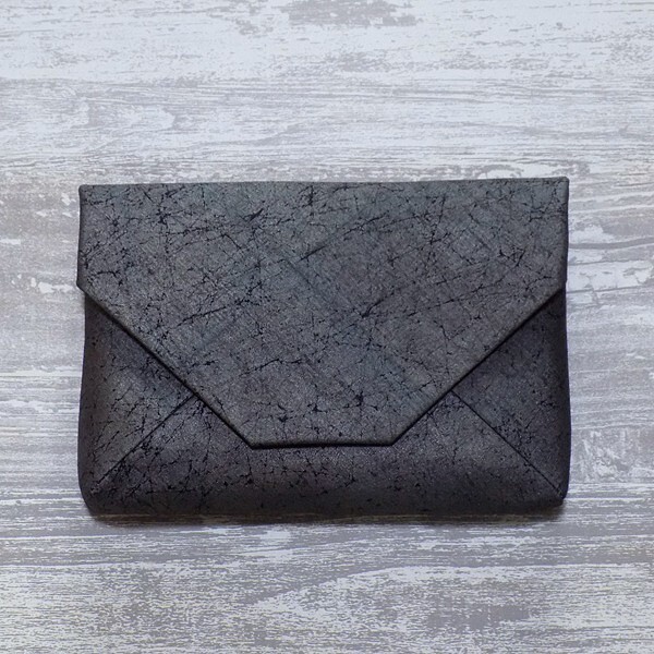 正絹紬紺色地製 数寄屋袋 クラッチバッグ 焼箔黒箔 真綿箔 燻し銀箔