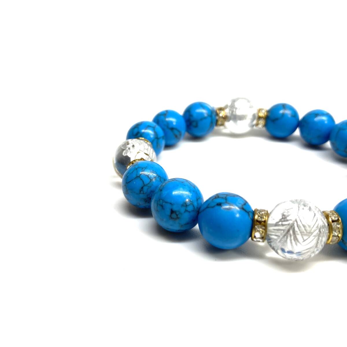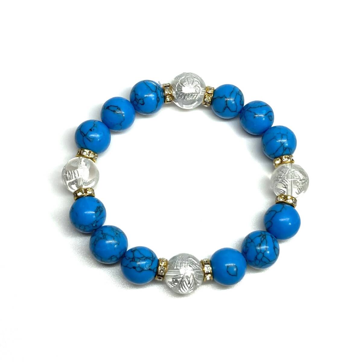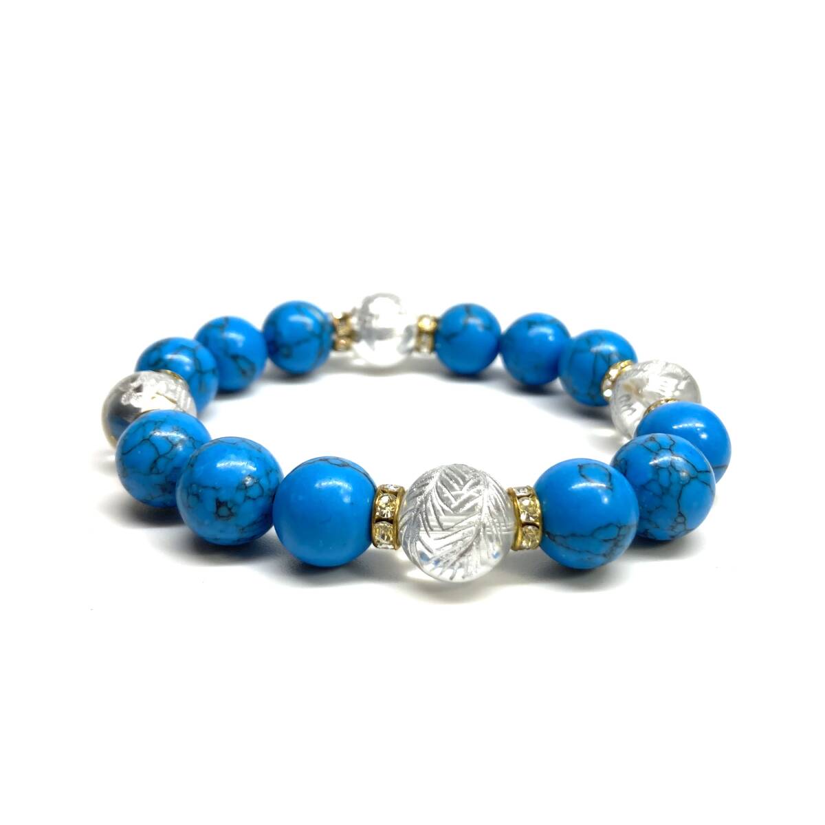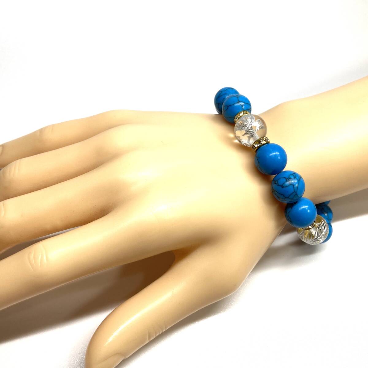 こちらは、四神獣銀彫水晶とターコイズを組み合わせたパワーストーンブレスレットです。四神獣は、中国の伝説で4つの方向(東西南北)を守護する神聖な神。四神獣、厄災から身を守り、多くの運気を呼び込むと言われております。石大きさは程よくインパクトのある12mm玉で内周 約17cmです。 数に限りがございますので気になる方はお早めにどうぞ。