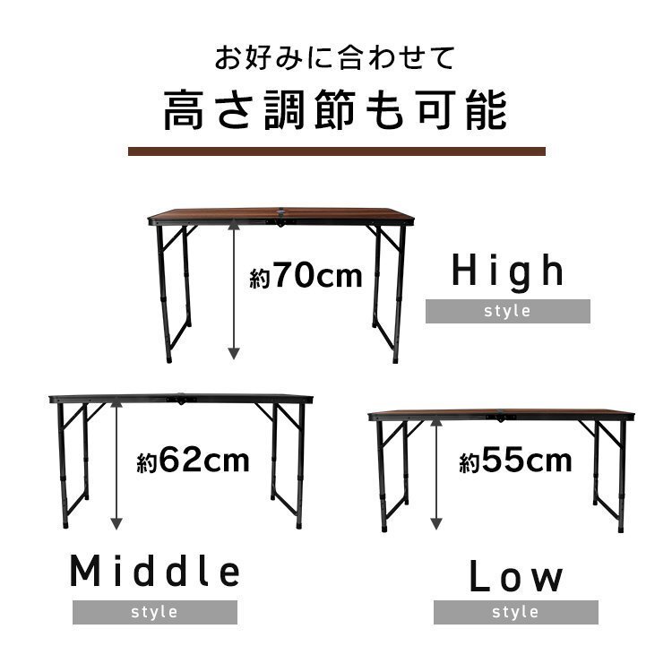 | かんたん組立の折りたたみ式アウトドアテーブル(4~6人用)です。 コンパクトサイズの120cm×60cm!! サビに強いアルミを使用! 天板には防水加工が施されています。 必要のない時は折りたたんで収納できる! 取っ手付きで持ち運びもラクラク♪ 高さは「ハイスタイル」「ミドルスタイル」「ロースタイル」の3段階調節。 お好みや用途に合わせて使い分けることができる嬉しい仕様♪ キャンプ、バーベキュー、お花見などにとても便利! ■商品コード:A61B010DWN ■商品仕様 カラー:ダークウォルナット サイズ:(約)120cm×60cm×高さ55~70cm(高さ3段階調節可能) 収納サイズ:(約)60cm×60cm×6.5cm パラソル用ホール直径サイズ(約):26mm 重量:(約)4.7kg 耐荷重:(約)20kg 材質:アルミニウム ■内容 テーブル本体、パラソル固定パーツ×1 ■注意事項 ・初めてご使用の場合、耐久性を高めるために天板がフラットにならず山なりになっております。 適度な力で上から押していただくと改善されますので、お試しください。初期不良ではございません。 ・海外製品で、簡易梱包での輸入のため風防に擦れや多少の小キズなどがある場合がございますが、 商品自体には問題ありませんのでご了承下さい。 ・商品は、モニターによって色合いが異なって見える場合があります。 ・仕様・デザインは改良のため予告なく変更することがあります。 ■保障期間 7日間 ※商品到着後7日以内の初期不良・破損のみご対応させていただきます。 【新品未使用品です】 |