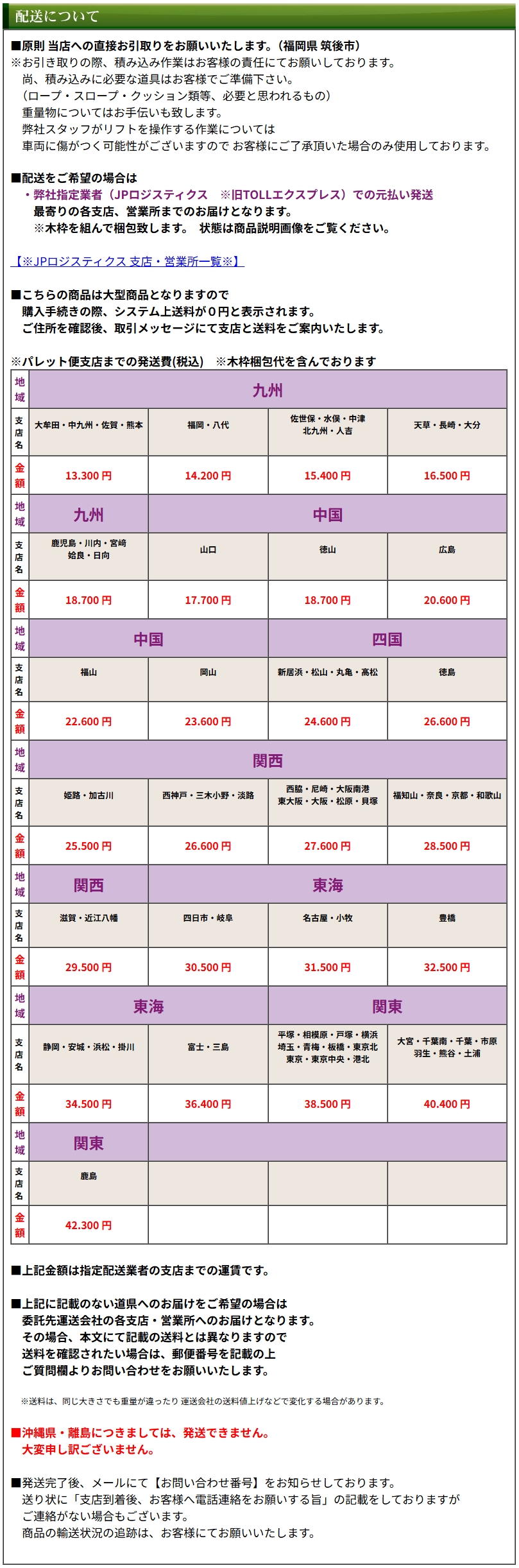送料が0円と表記されている商品は原則直接引取りをお願いしております 商品の発送をご希望されるお客様につきましては システム上0円と表記されますが、 お届けには送料が発生致します。 配送方法は■福山通運 ■JPロジスティクス(旧TOLLエクスプレス) のいずれかのパレット便となります。 お届けは、ご自宅ではなく最寄りの支店留めとなります。 詳細は、「配送について」の欄へ記載しておりますので、必ずご確認頂き ご検討下さいますようお願い致します。 |