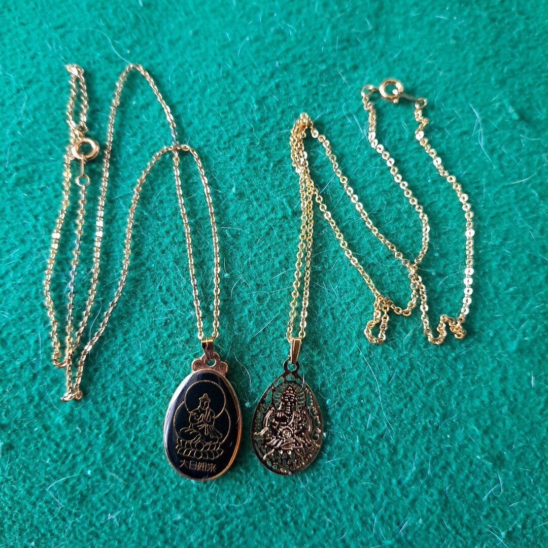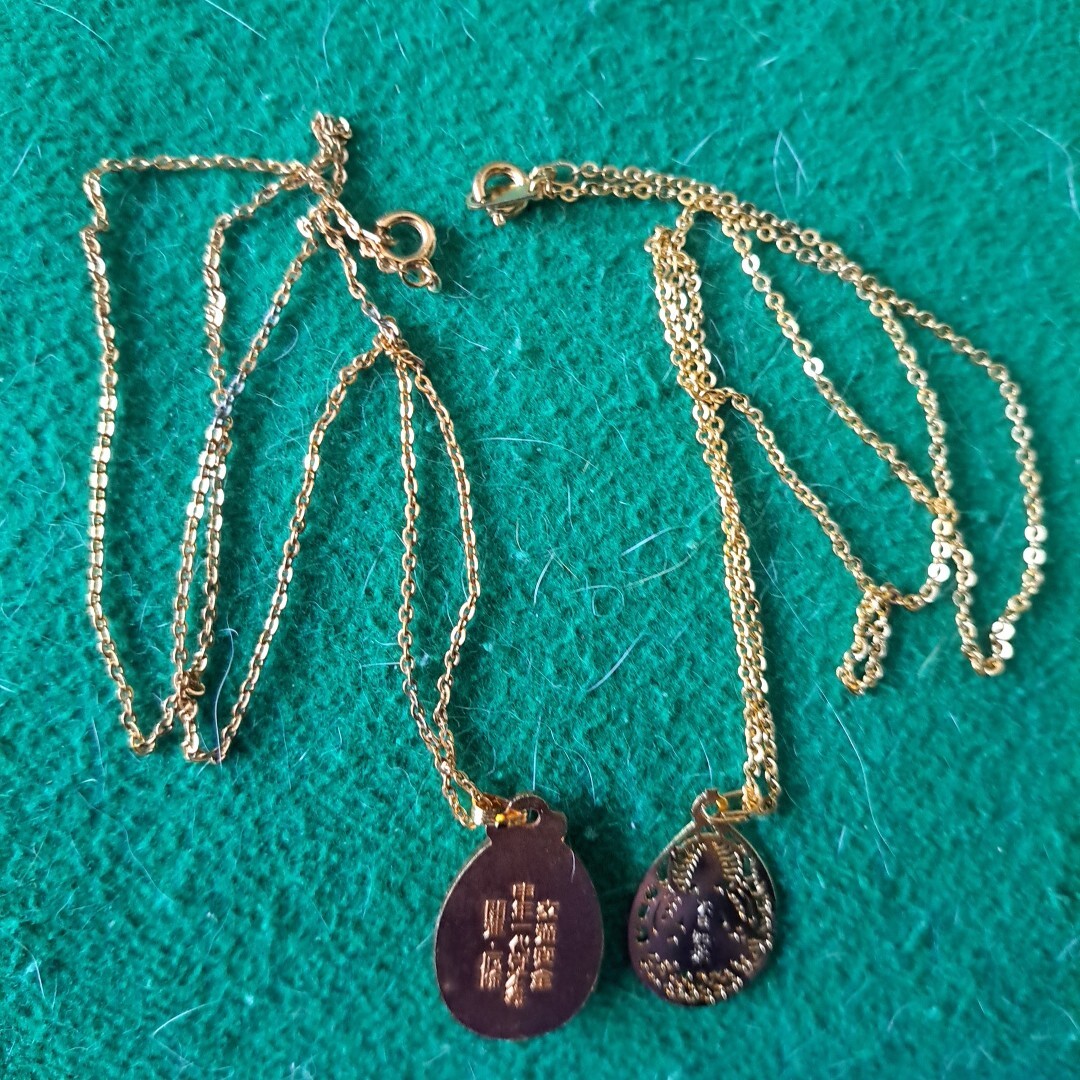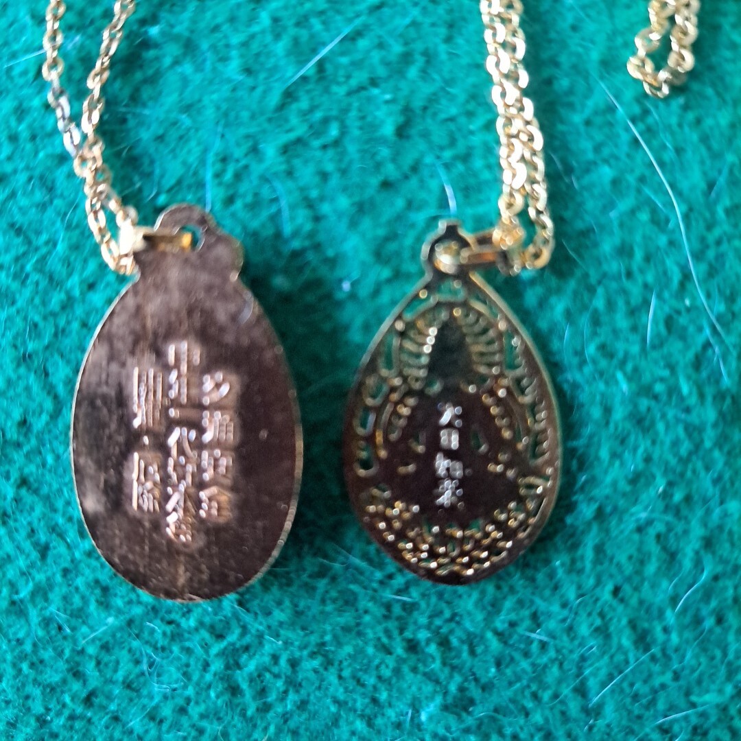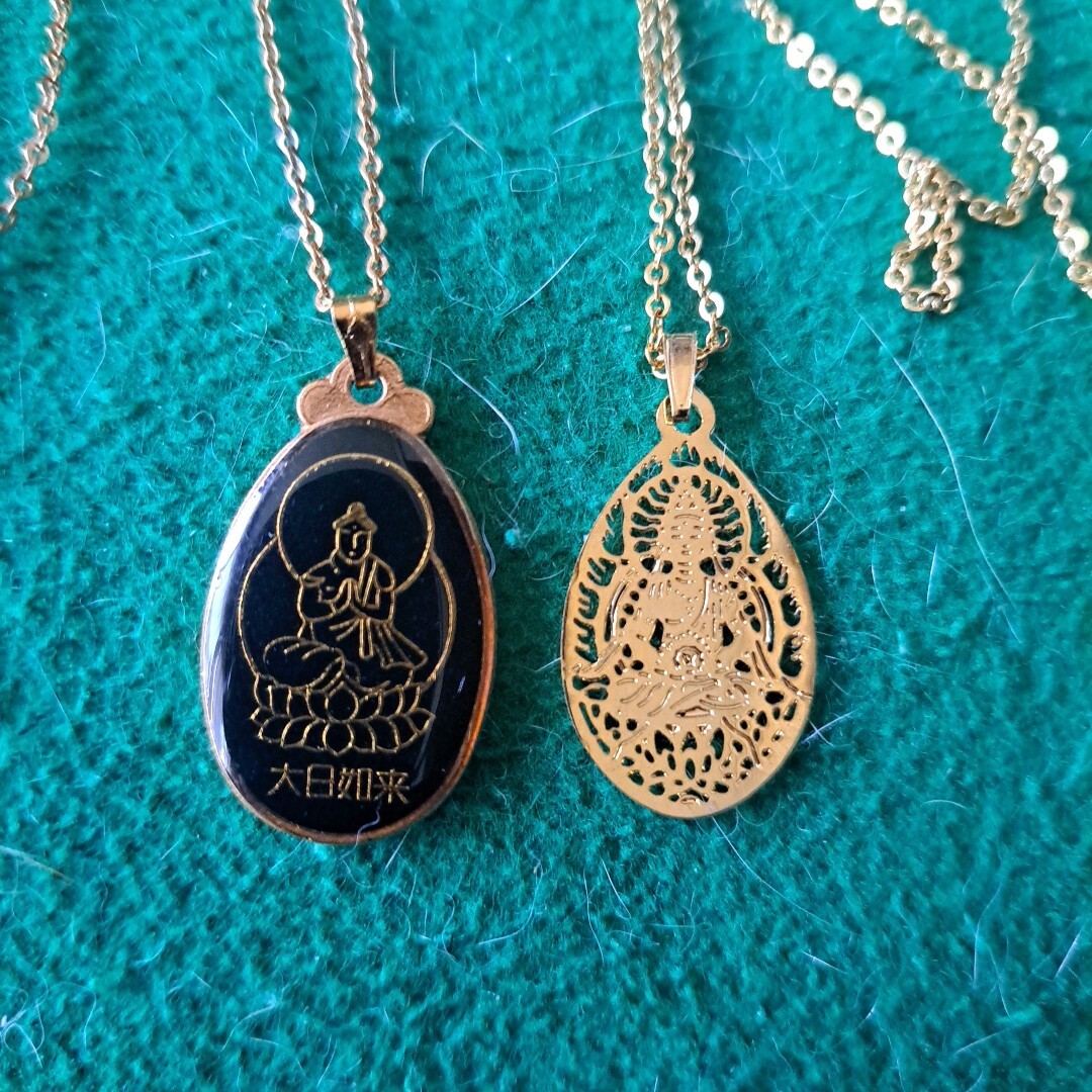 大日如来と書かれており、黒のペンダントの裏には交通安全、申年一代守本尊、開運、厄除と書かれています。