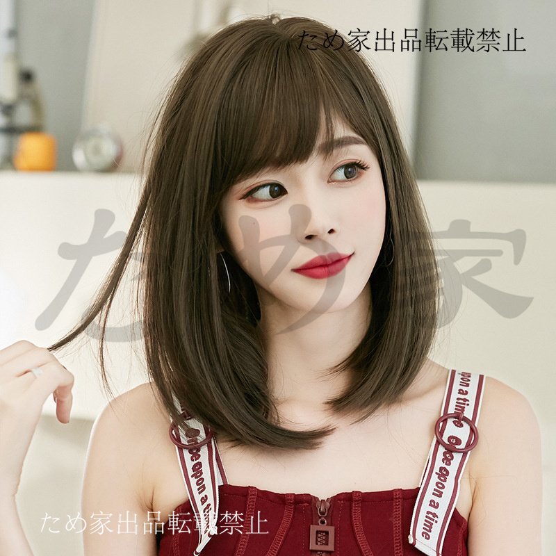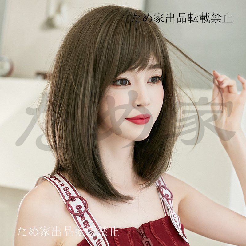新品人毛 ミディアムショルダー 冷たいブラウンカラー ウィッグ つむじ部分手植え 自然に見えますフルウィッグ