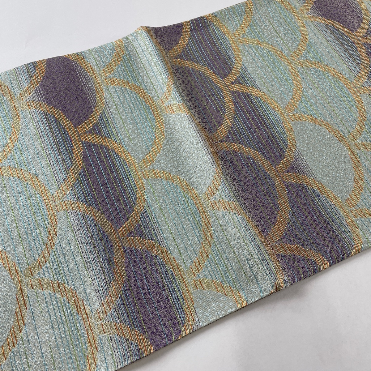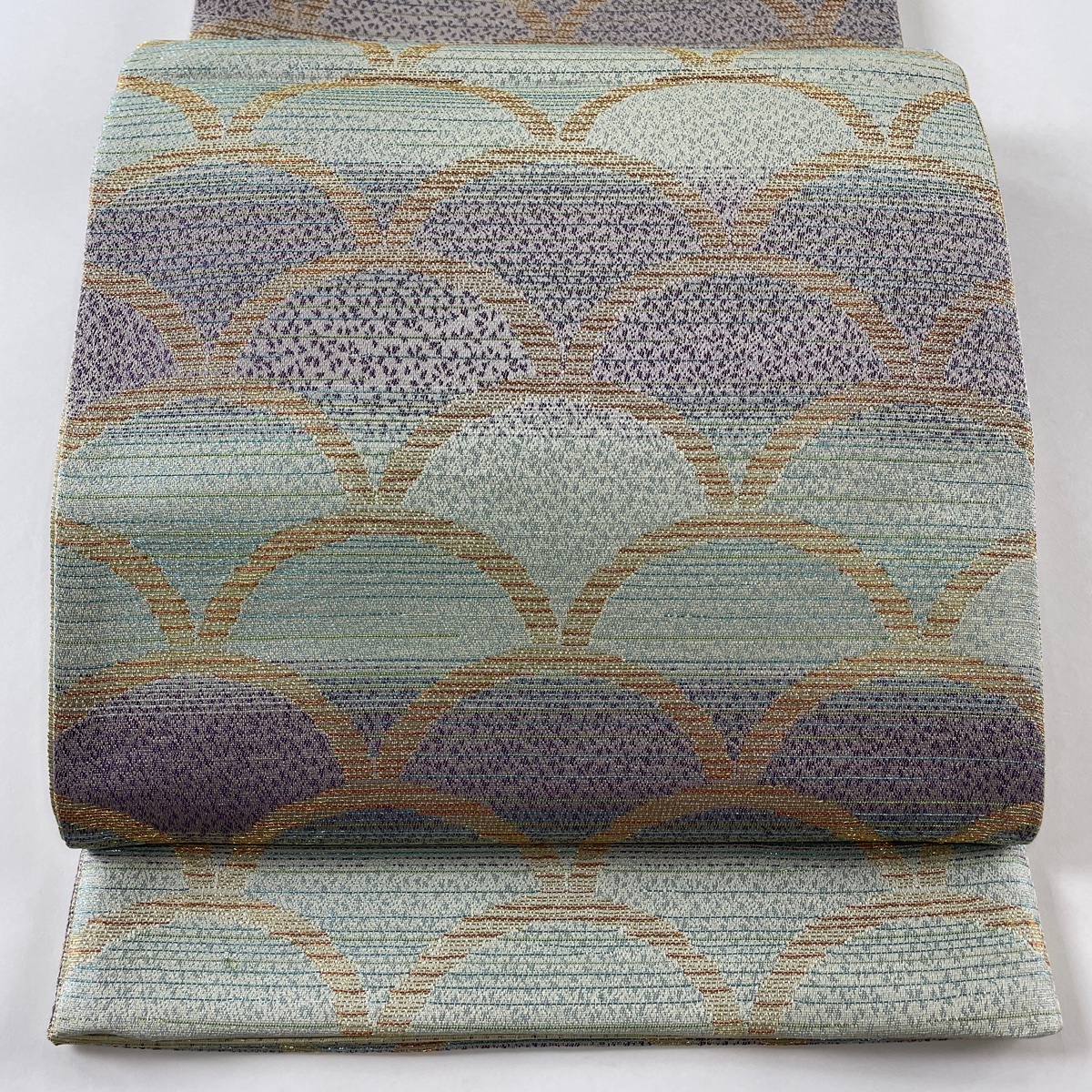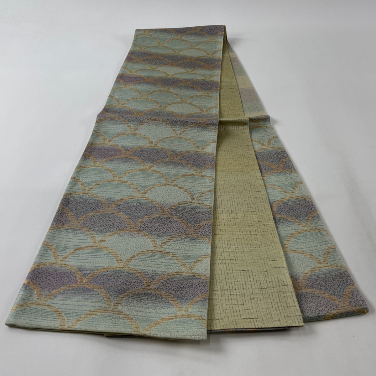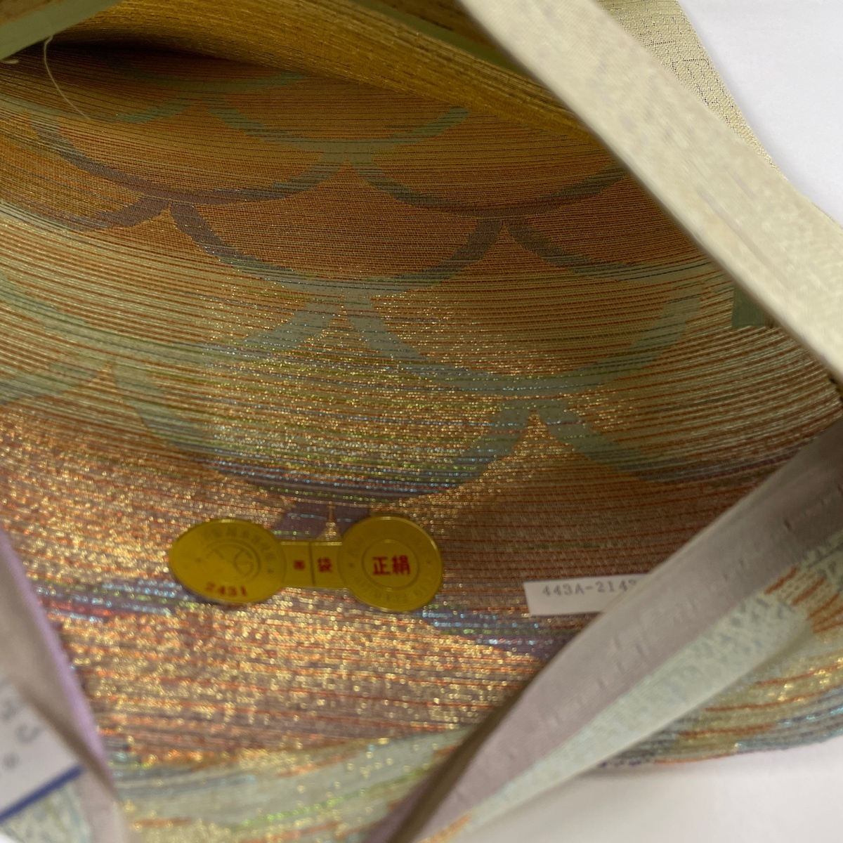 | 袋帯 美品 秀品 証紙 青海波 横段 金糸 ラメ糸 薄緑 六通 正絹 【中古】 |