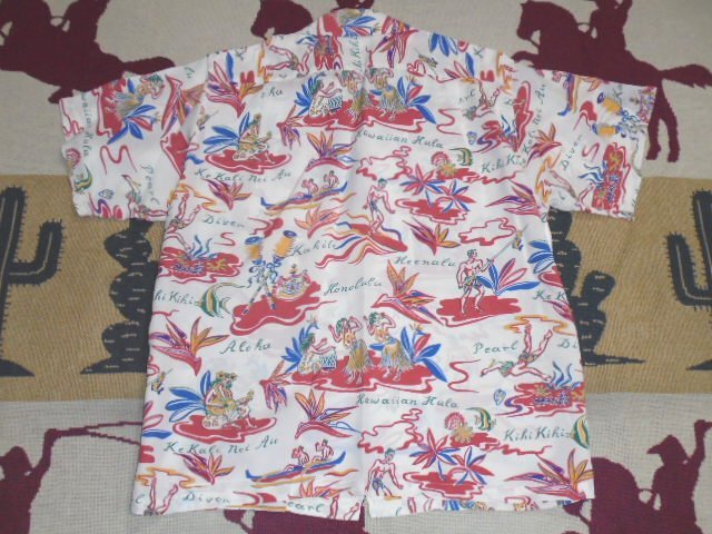 フラ、ダイビング、サーフィンなど、ハワイのアクティビティは当時からアロハシャツのモチーフとしても人気が高かった。戦後から本格的にシャツのマーケットに参入したホロホロ・アパレル・マニュファクチャリング社のブランド「ホロホロ」が製作した一枚。トーマス・スティールによって書かれたアロハシャツの専門書「The Hawaiian Shirt」にも掲載されており、ヴィンテージ・コレクターからの支持も厚く、コンディションの良い個体に出会えるチャンスは少なくなってきている。