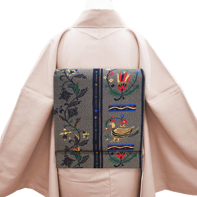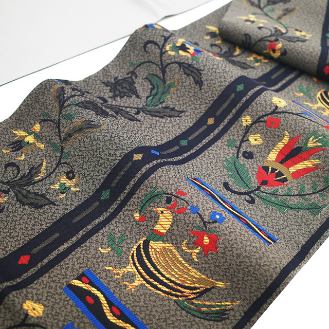 【新古品】 袋帯 未使用 正絹 京都 西陣 おぐら 和楽 ブランド グレー 草花 鳥 織り柄 洒落帯 おしゃれ カジュアル 袋帯 春 秋 冬 仕立て上がり みやがわ sb53851