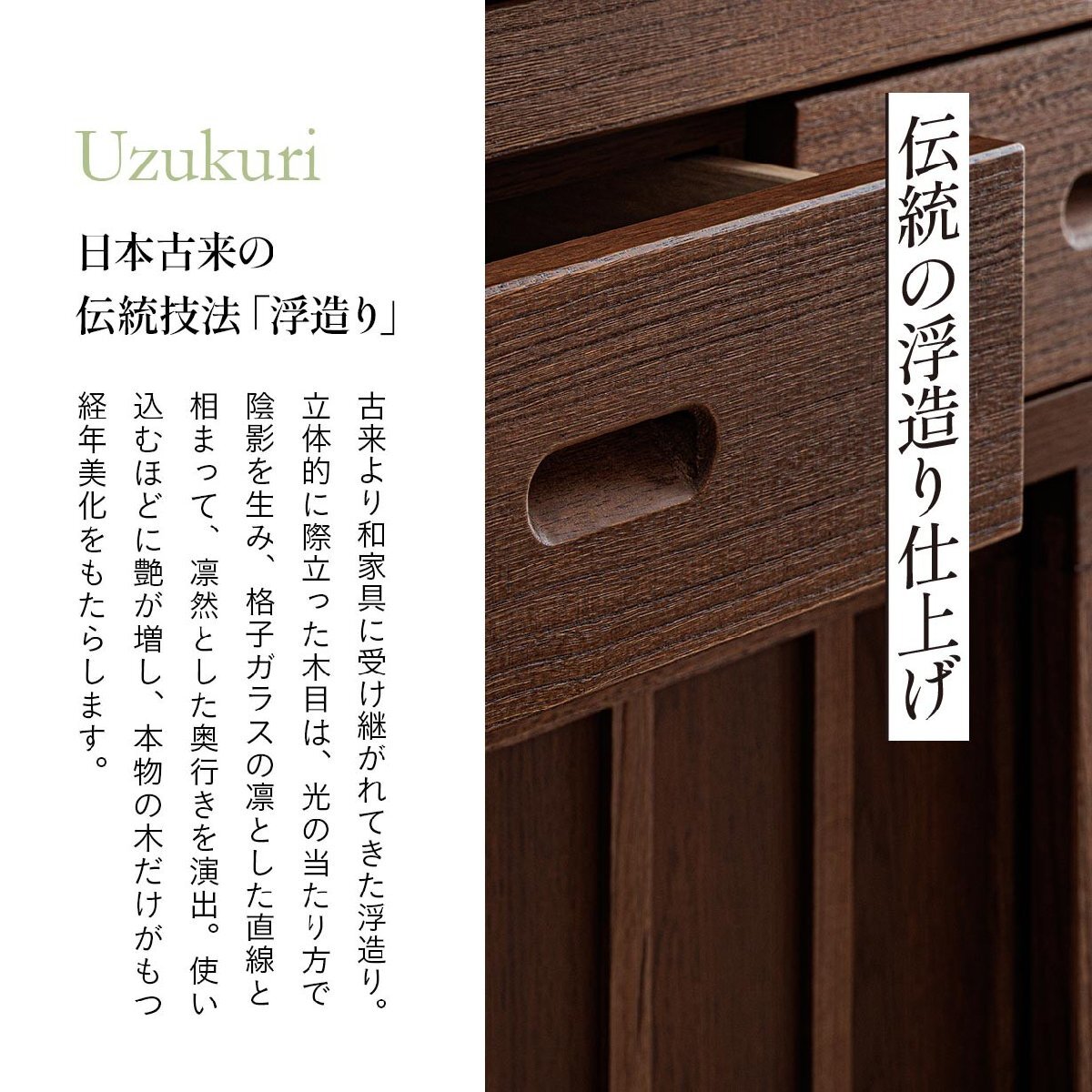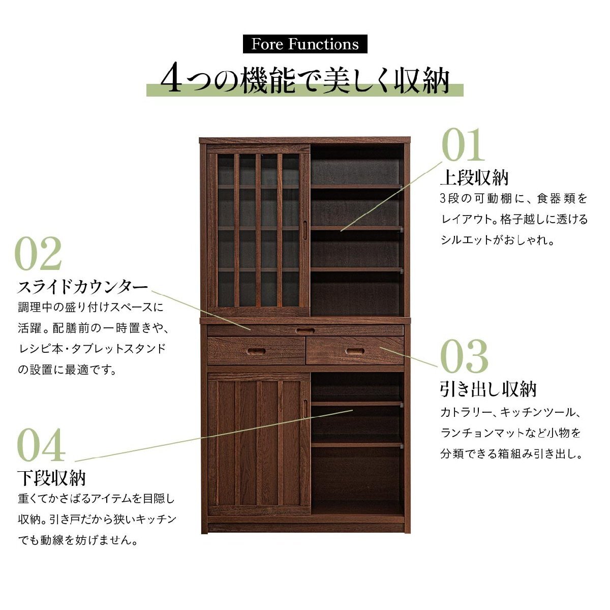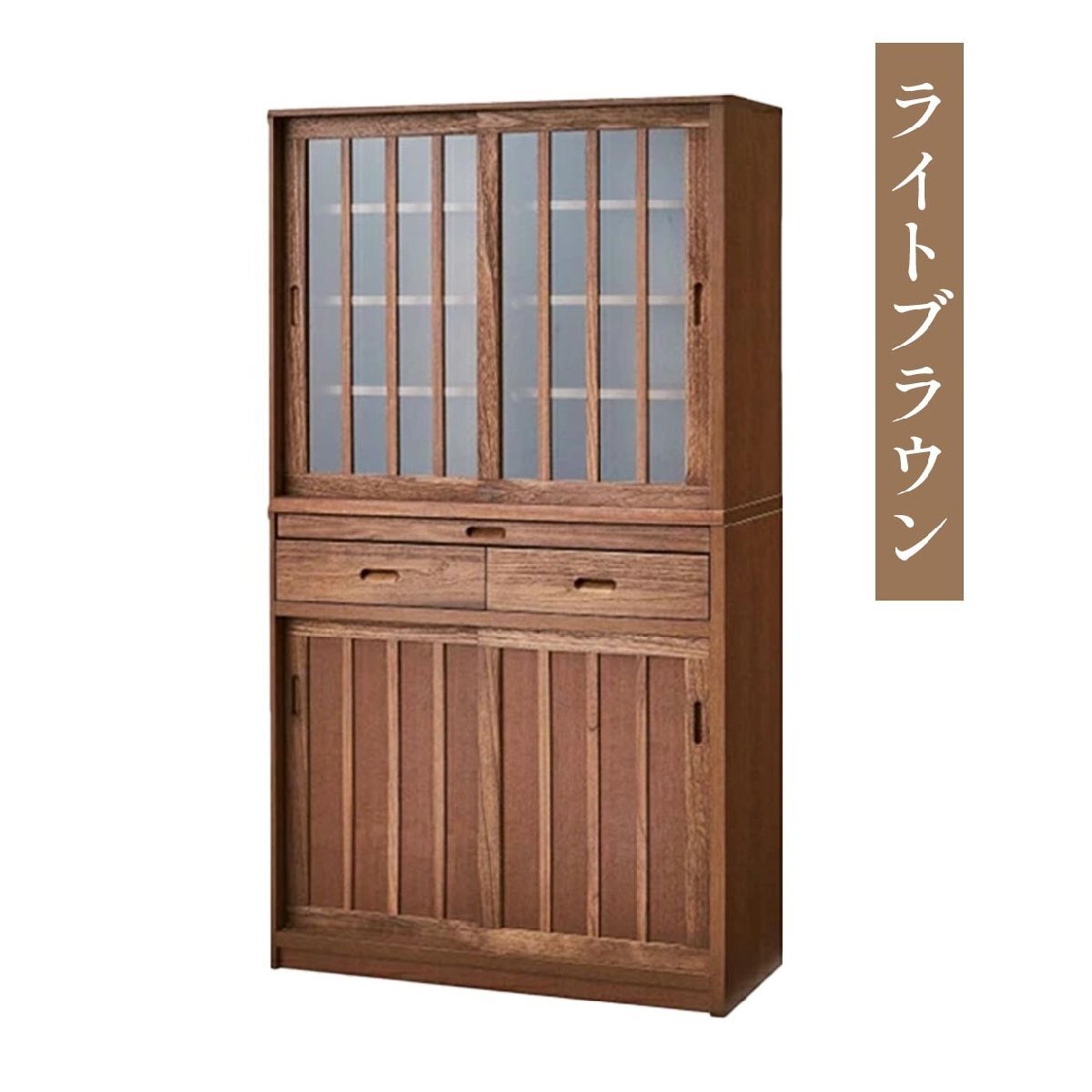 食器棚 キッチンボード 幅90cm カップボード グラフィックスダボ スライドカウンター付 スライド戸 ライトブラウン
