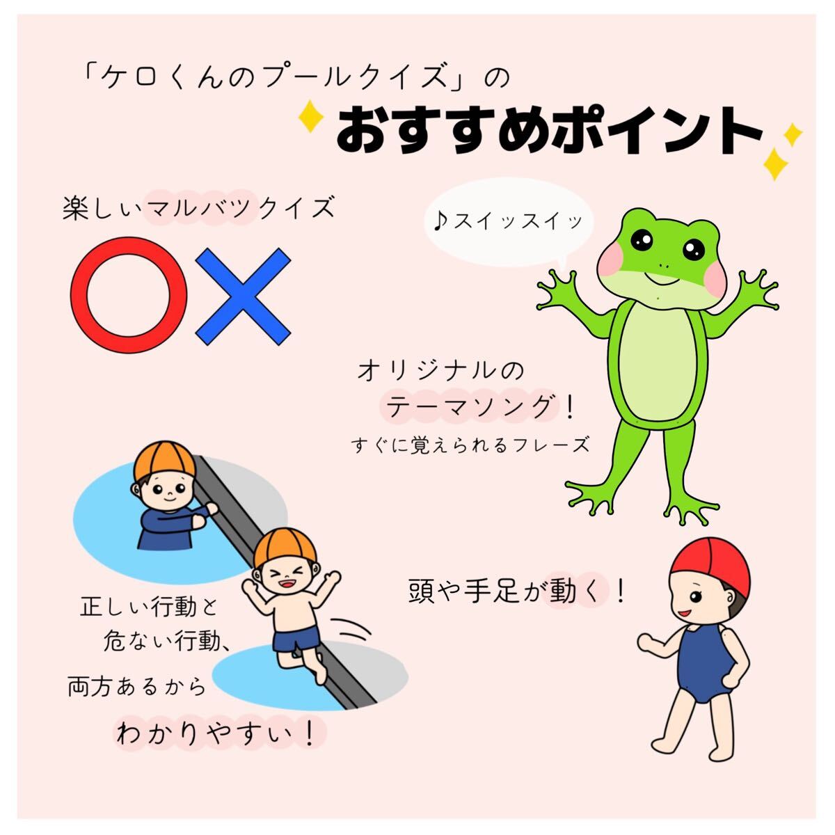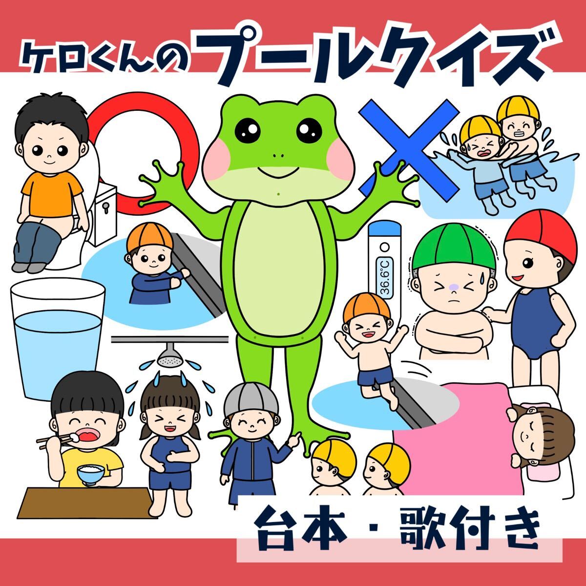 泳ぐことが大好きなケロくん!プールを楽しむための大切なお約束をみんなに教えに来てくれました。「♪すいっすいっゆーらら」と楽しいテーマソングを歌いながら、クイズを出していきます。さあ、みんなで答えていきましょう!