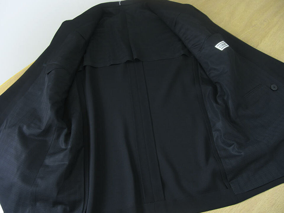 素材は表地ウール70%、ポリエステル30%、日本製、ダブル4ツボタン、背抜き、膝裏付き、ワンタックパンツ。
