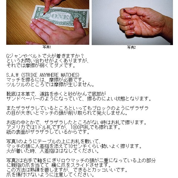 靴底やコンクリート、千円札等、ザラザラしたところで擦って何気なく着火し、スマートにスモーキングするのがクール。