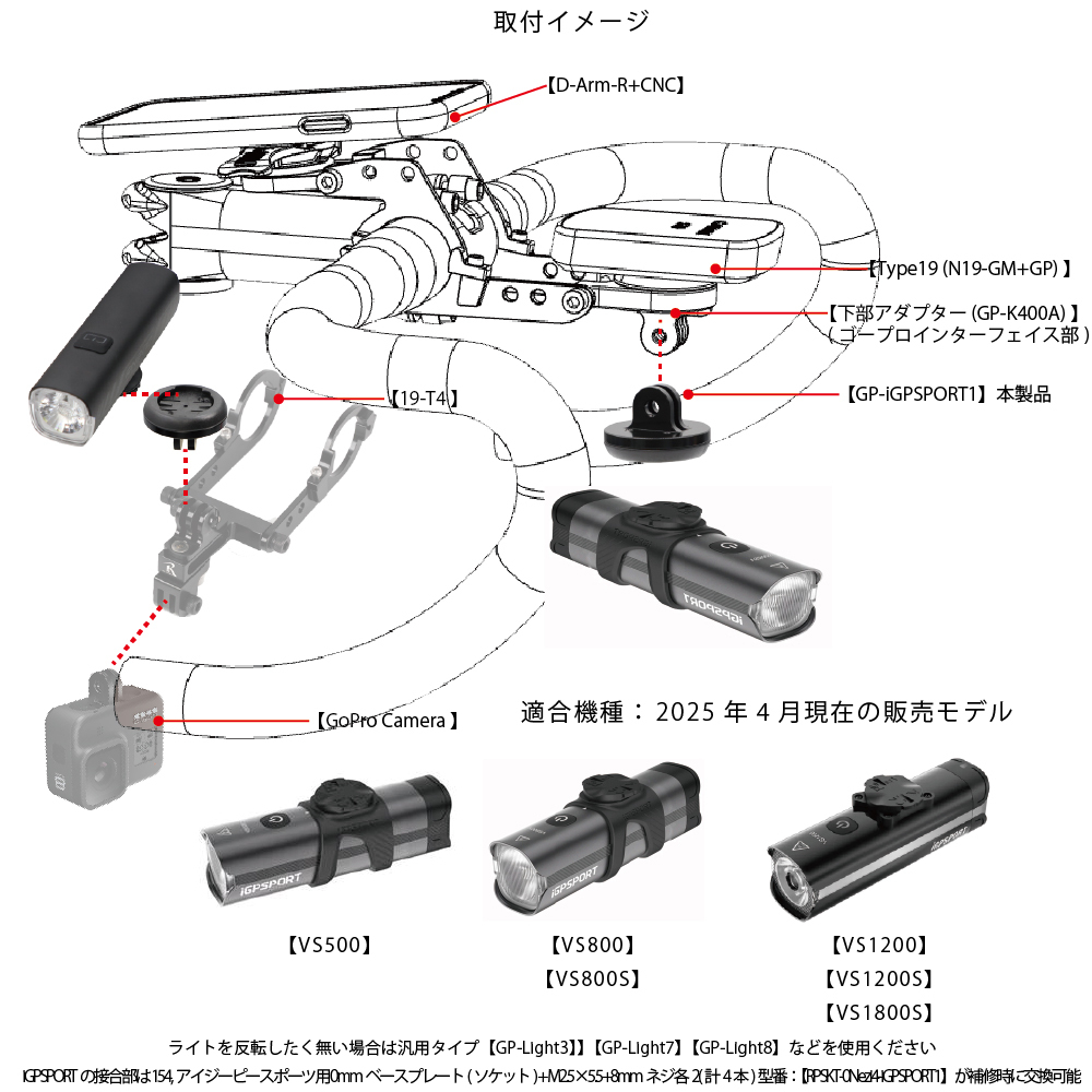 型番:【GP-iGPSPORT1】ゴープロインターフェイスのあるマウントやアダプターから「自転車 ライト VS500 / VS800 / VS800S / VS1200 / VS1200S / VS1800S 」に変換