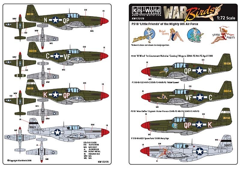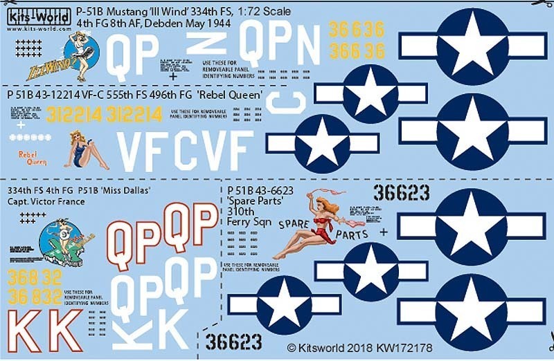 Kits-World(172178)1/72 P-51B Mustang 43-6636 QP-N-'Ill Wind' 334th FS 4th FG Debden May 1944他用デカールです。