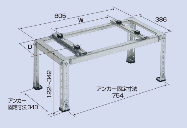 - アンカー固定寸法は幅754mm×奥行343mm、安定した取り付けが可能。