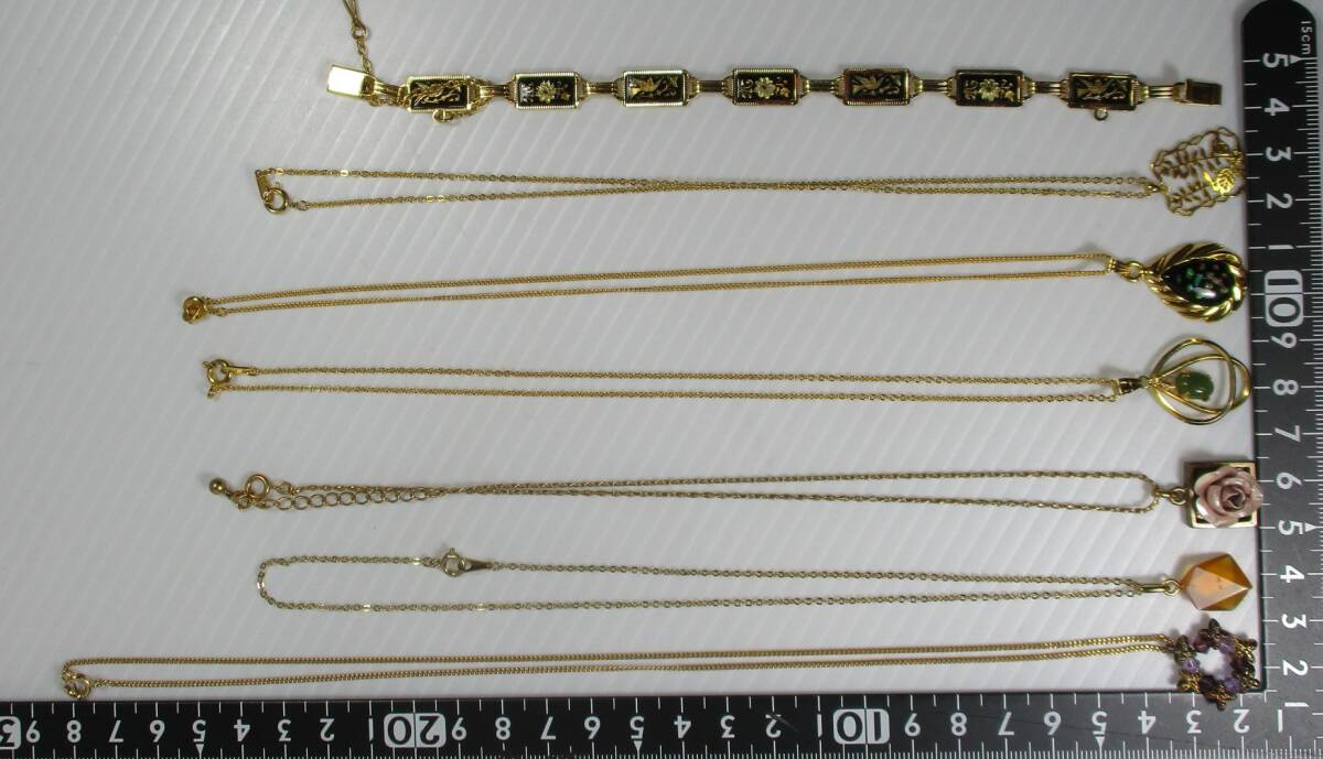 商品名: ネックレス 6点 ブレスレット1点 計7点セット サイズ: 画像でご確認ください。 ランク: A~B 付属品: 本体のみ 【状態】 ブレスレットに汚れが多少あります。ネックレスは綺麗です。 完全美品を求められる方や神経質な方はご遠慮ください。 画像が全てになります。画像でご判断ください。 *****販売している全商品について***** 【補足】 ランクにより、見受けられるダメージのあるときは、できるだけ画像表示又は記載してありますが見落としのある場合はご容赦ください。 尚、商品によっては、ほつれ・汚れ・動作不都合などの補修・修理・部品交換・お届け時に電池残量0で電池交換などの必要な費用は、全て落札者様でご対応ください。 《ご注意・ご確認》 【状態】・【補足】欄の内容をご確認いただきご入札ください。 ノークレーム・ノーキャンセルでお願いいたします。 *****下記もお読みください***** 〈ランクを記載している場合の評価について〉 SA : 数回使用した程度のかなり綺麗な中古品 A : キズ汚れがほとんど見られない・目立たない綺麗な中古品 AB : よく見ると小さなキズが少し見えるが、目立つキズは見られない綺麗な 中古品 B : 小さなキズが見られるが程々にきれいな中古品 C : 全体的に使用感があり多少キズのある中古品 D : かなり使用感がありキズ汚れが目立つ中古品 〈ご確認ください〉 ● used品になりますので神経質な方はご遠慮いただき、ご理解のうえノークレーム ノーリターンでお願いします ● 商品ランク、コメント等は当方での評価です。 ● PCの環境上、実物の色と若干違う場合がございます。 ● ブランド品及び貴金属は全て鑑定済みの本物商品ですのでご安心下さい。 万が一、正規ブランド店での判断が偽物とした場合は、確認後に全額返金いたし ます。(お届け日を0日として5日以内にご連絡をください。ご連絡がなく5日を 過ぎた場合はお受けできません。) ● 申し訳ありませんが、土曜、日曜、祝日、お盆、年末年始休暇等は休業の為 ご質問、取引連絡、発送等にお応えすることができません。 平日でも業務の都合や留守の場合は、ご連絡が遅くなることがあります。 ● 応対時間 ~17:00頃までになります。 | ||||