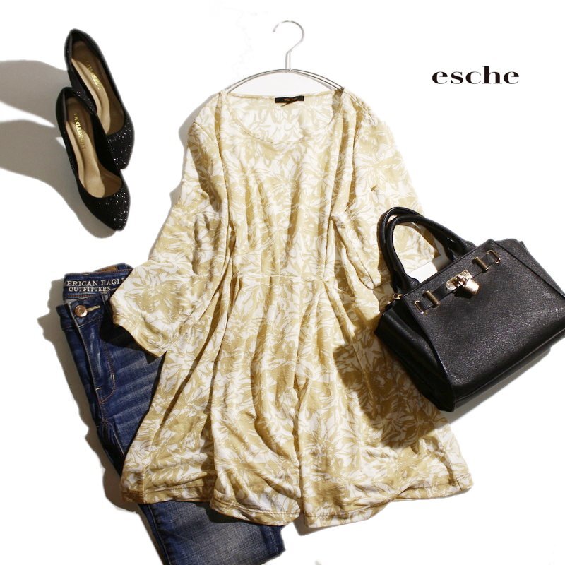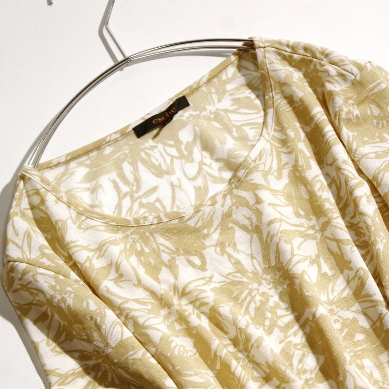 美品 エッシュ esche 株)ワールド 大きいサイズ44 春 夏 ストレッチ イラスト 手書き フラワー 柄 プリント ロング ジャージー カットソー