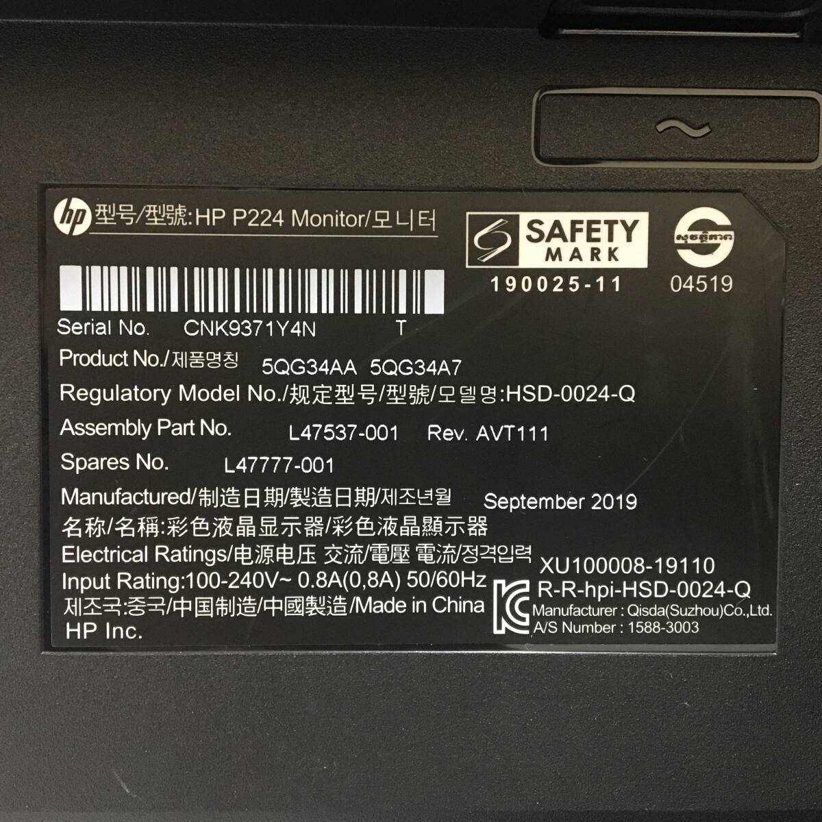【美品】HP P224 ワイド液晶モニター 21.5インチ フルHD(1920x1080) 入力端子『HDMI/Displayport/D-Sub』 動作品