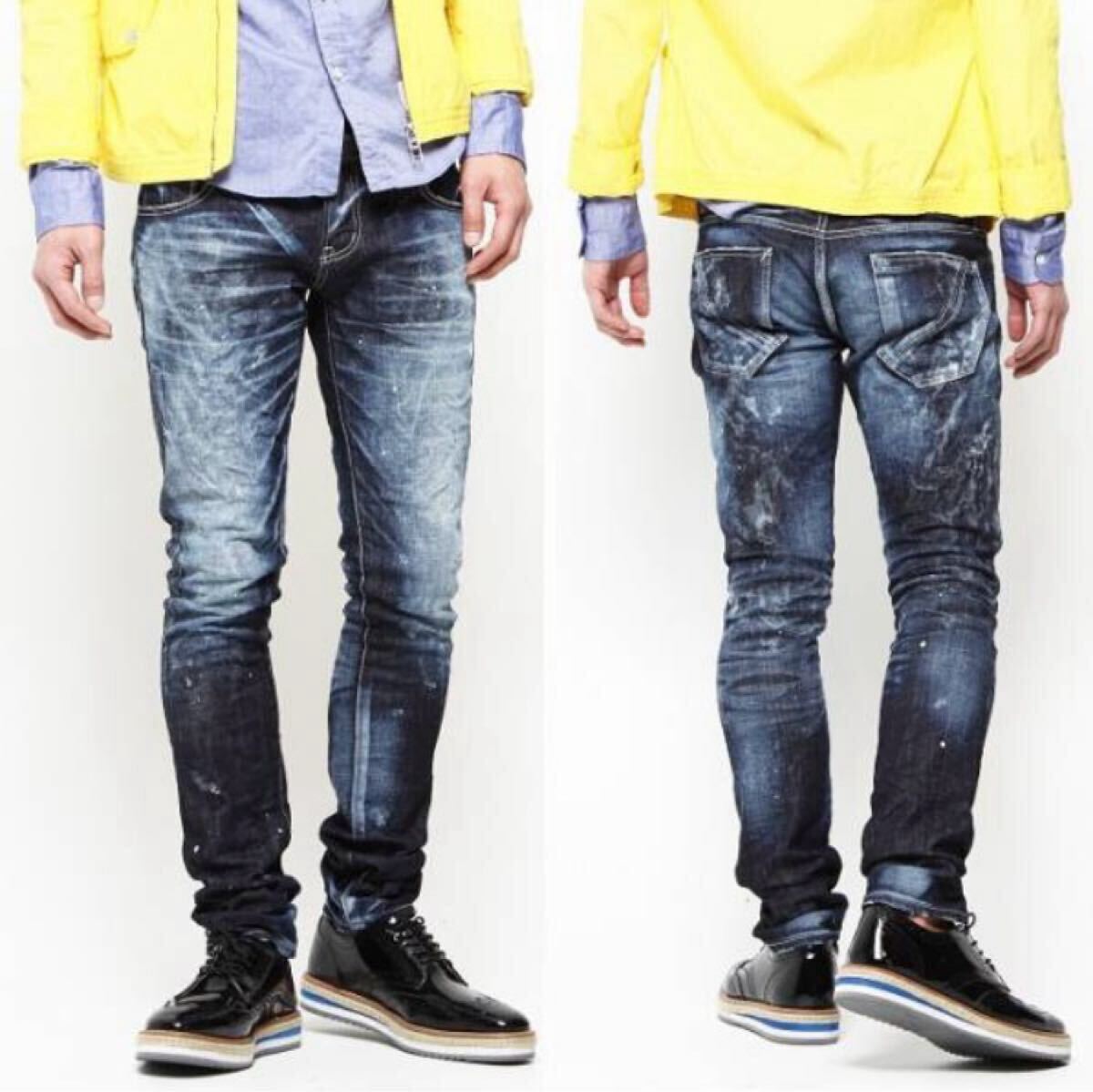 ディテール:中濃色のデニム生地にホワイトペイントとダメージ加工を全体的に施した一本。