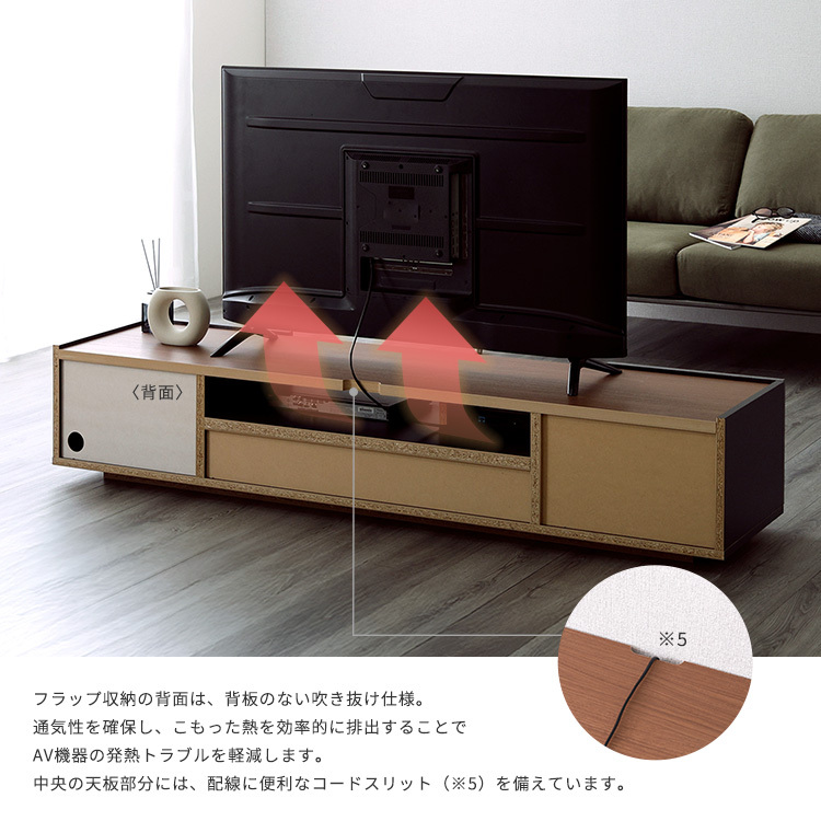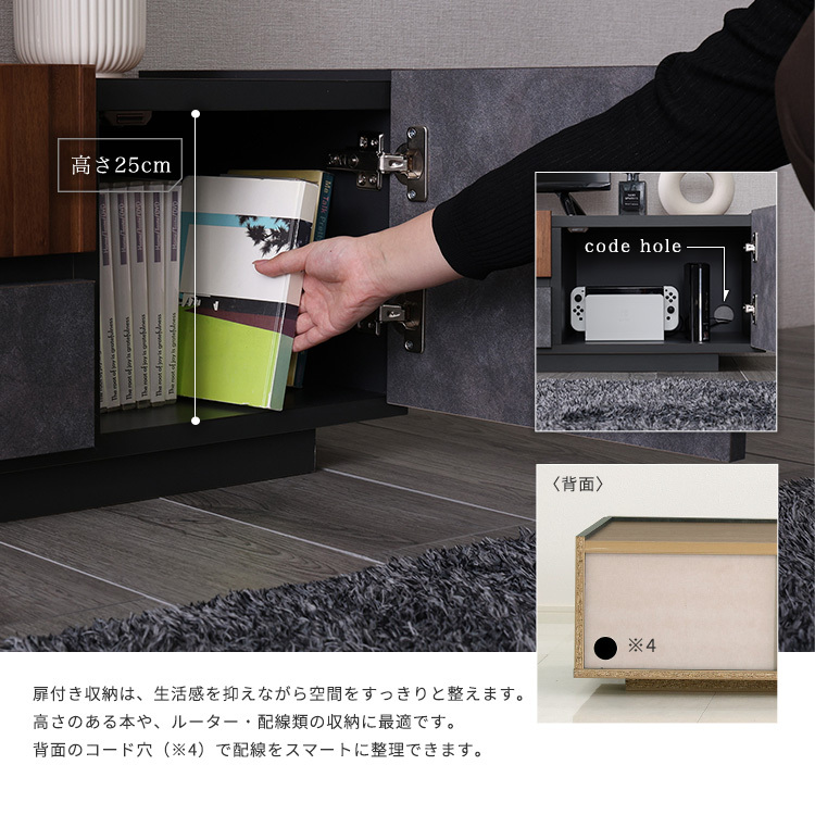 AV機器をゆったり置ける収納スペースに引き出し収納や扉付き収納があるので大容量で収納できます!