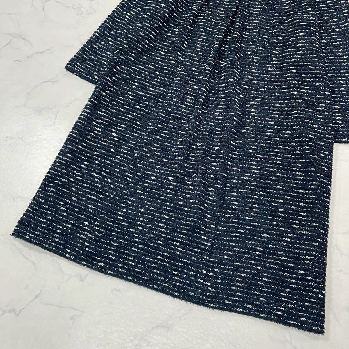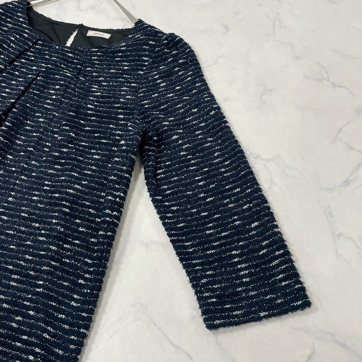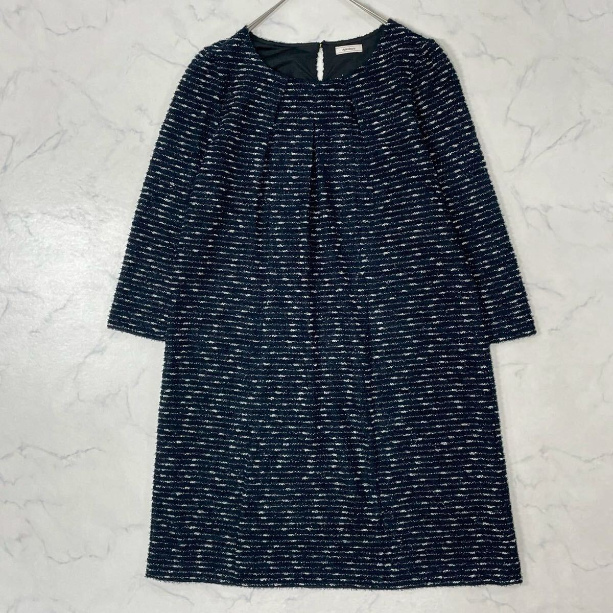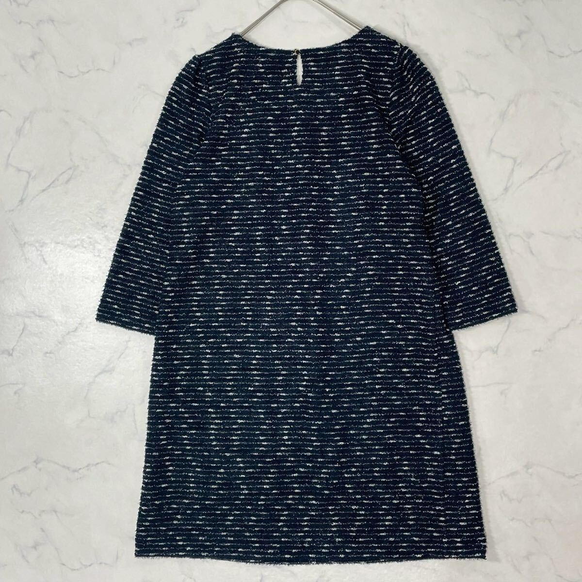 大きいサイズ ボーダー ツイード 裏地付き ラメ タック クルーネック ボタン 長袖 ひざ丈 ワンピース