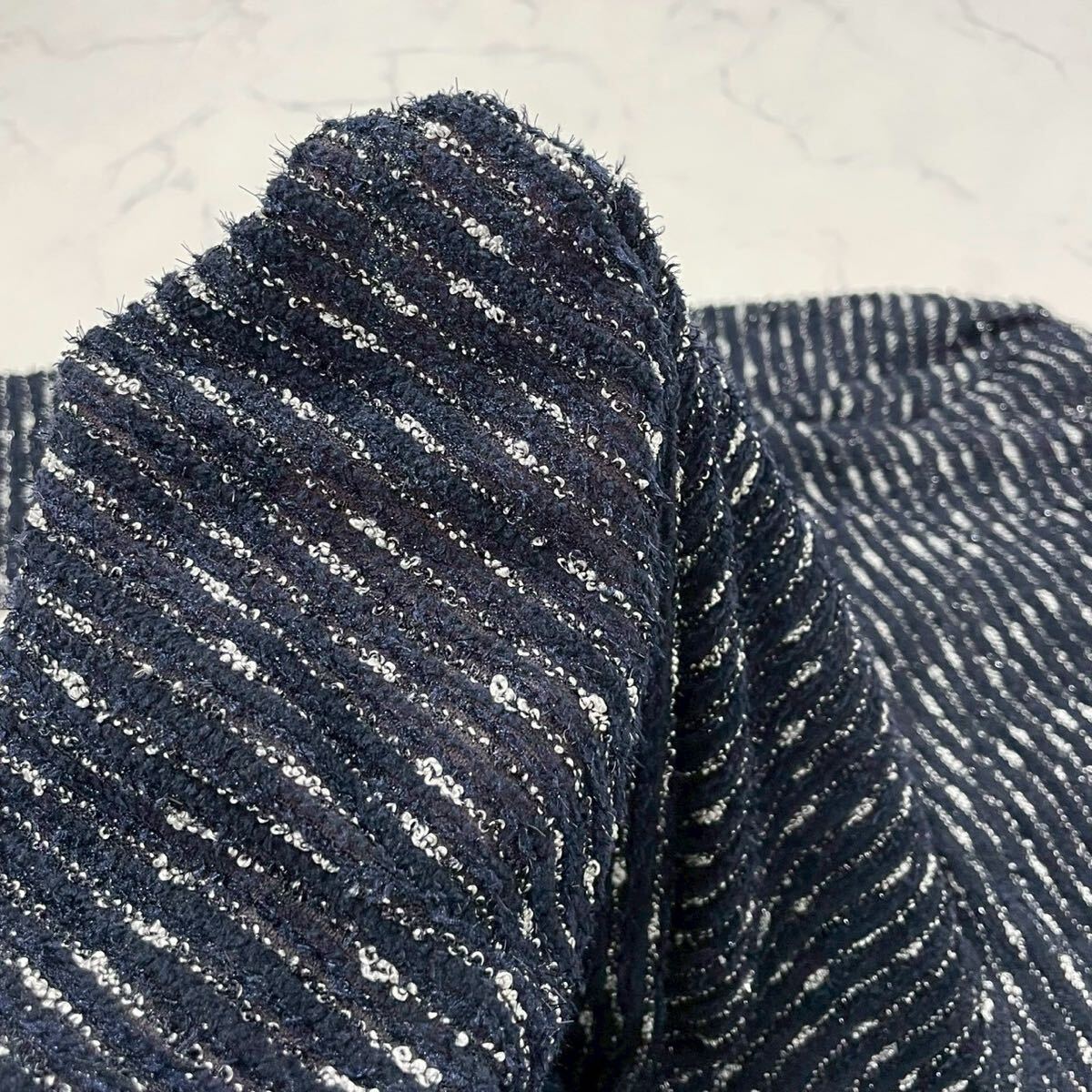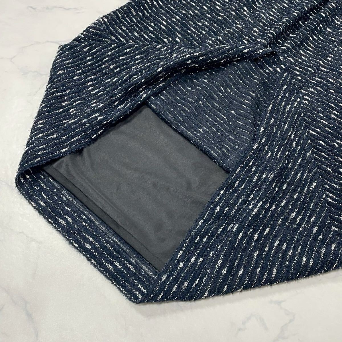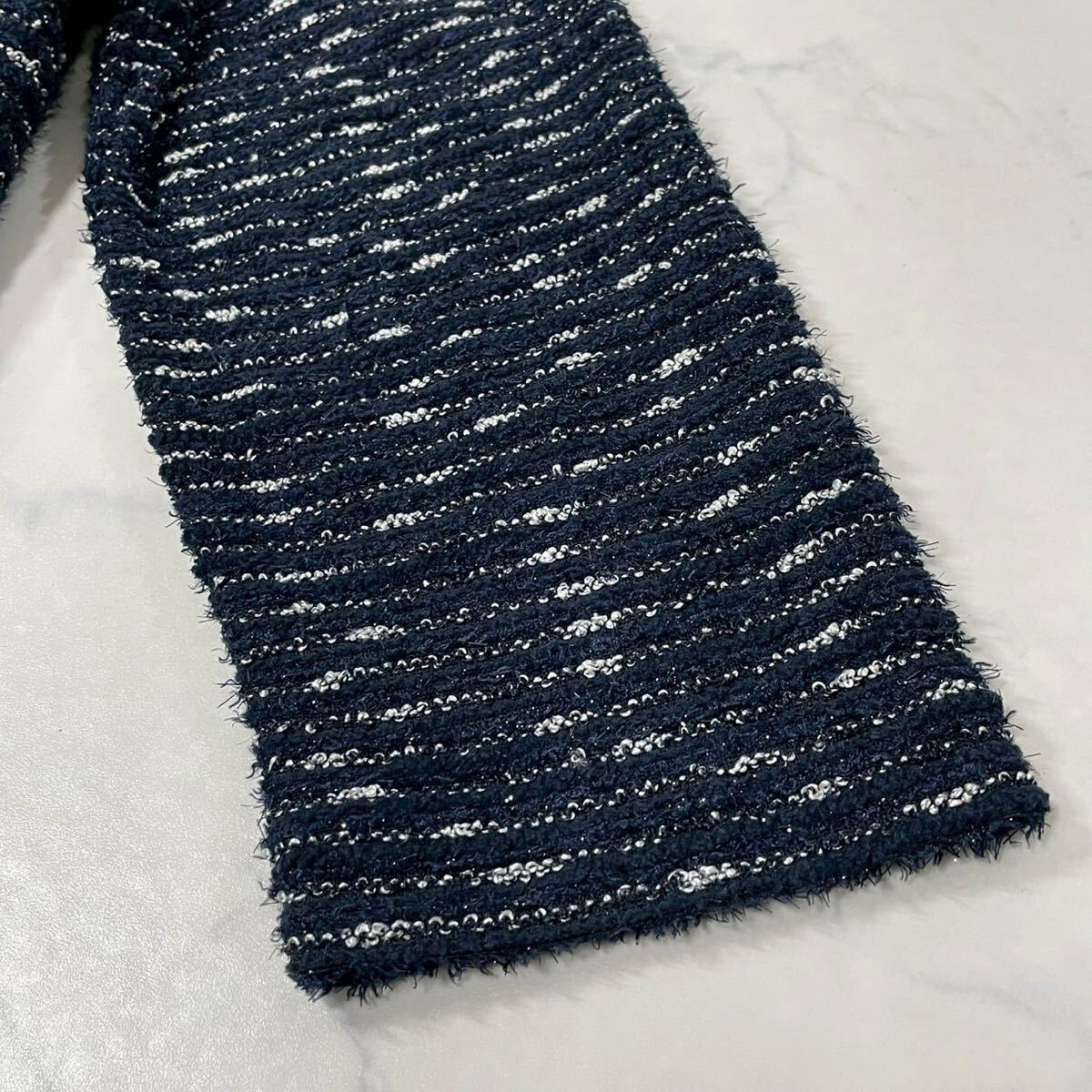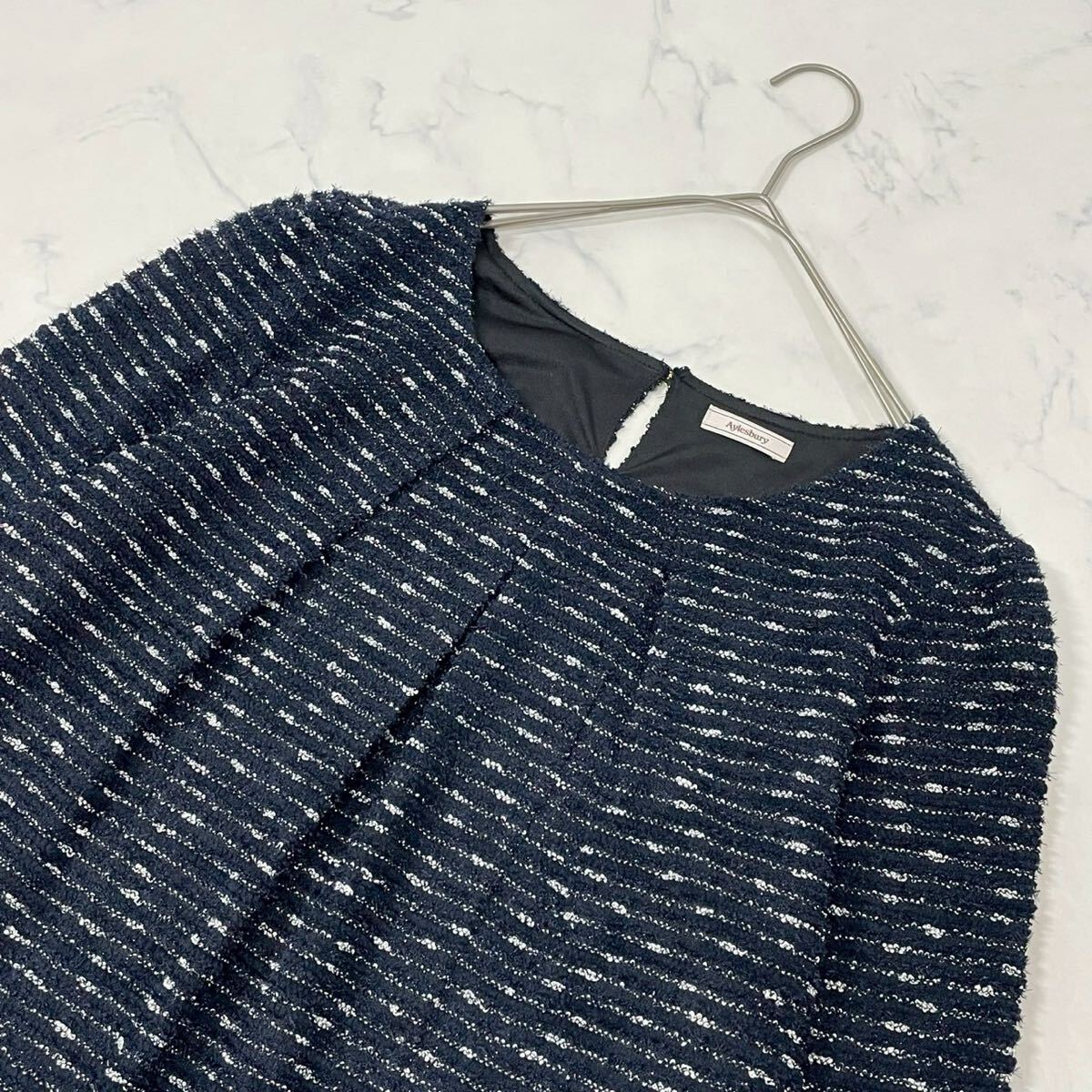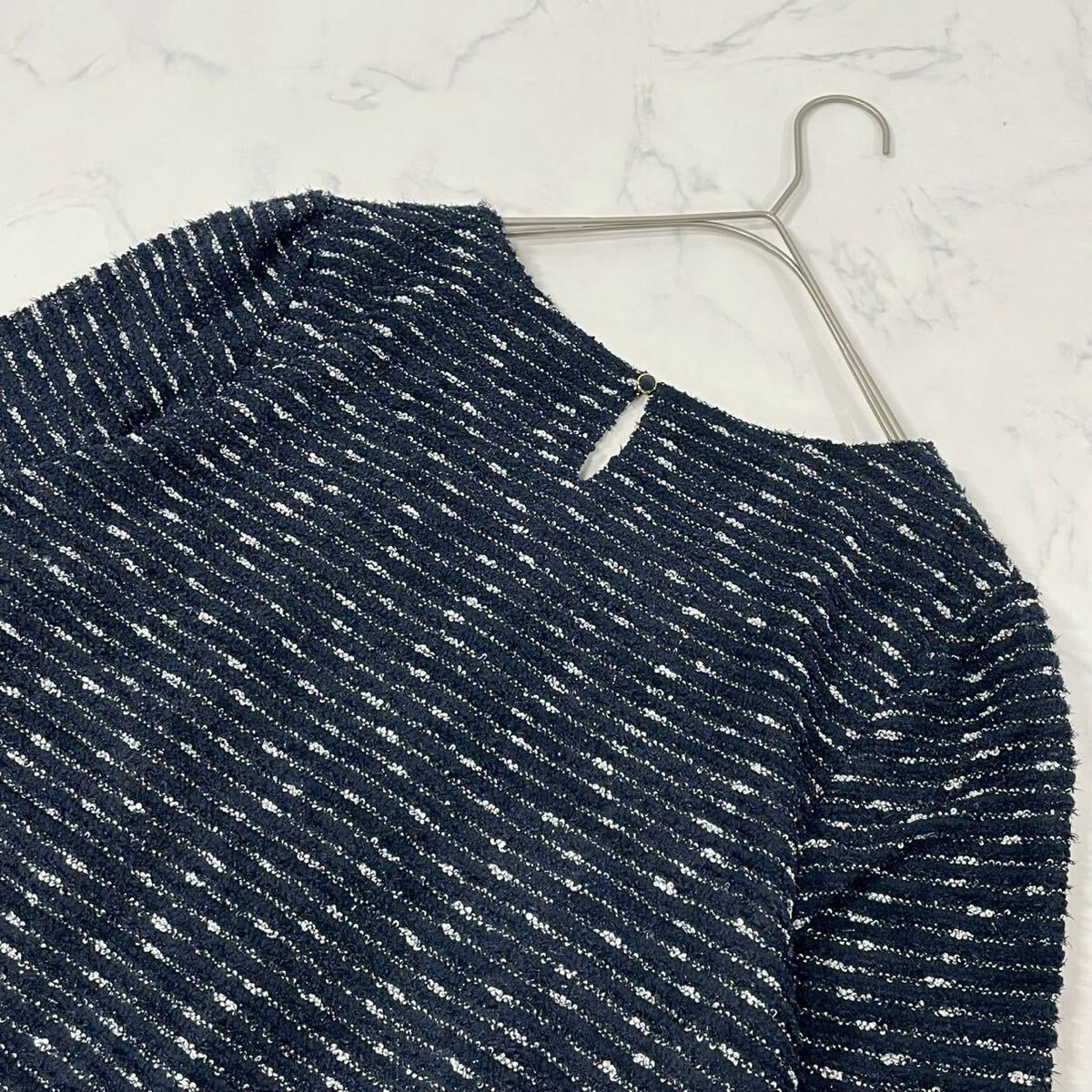 大きいサイズ ボーダー ツイード 裏地付き ラメ タック クルーネック ボタン 長袖 ひざ丈 ワンピース