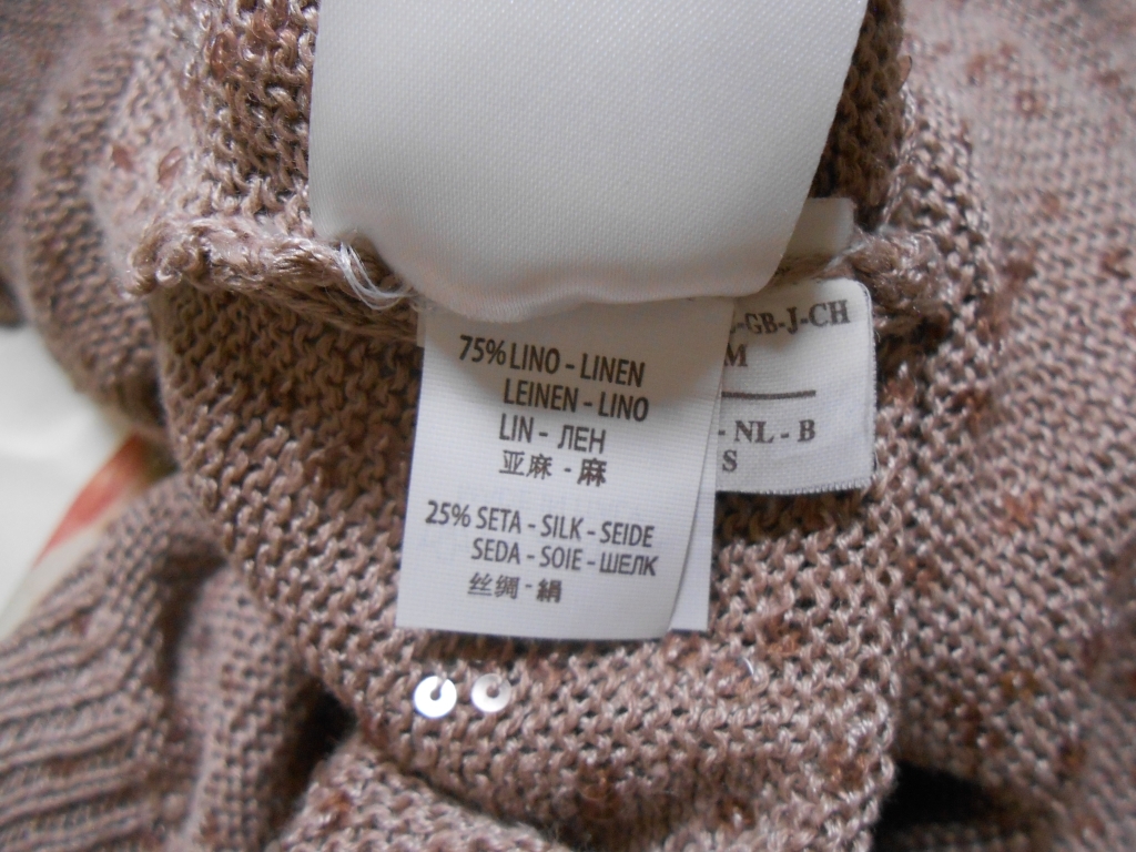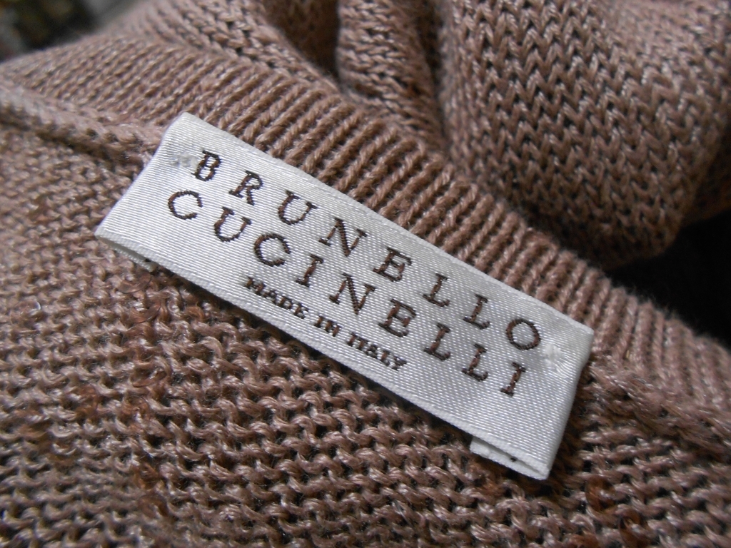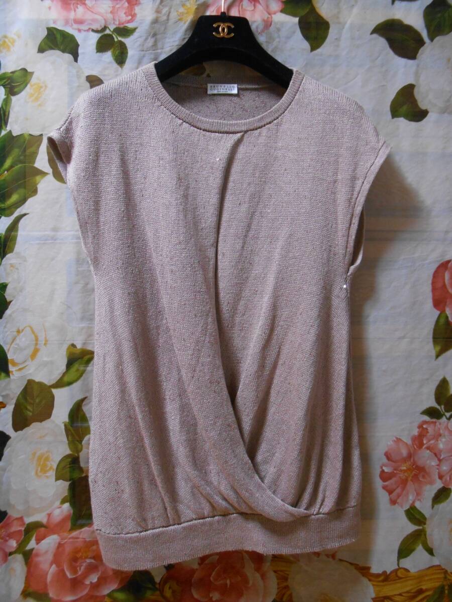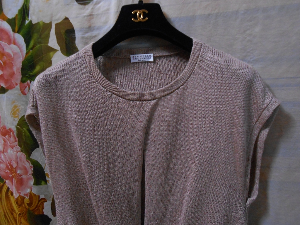 セレブ愛用品、ブルネロクチネリトップス。素材表記は麻5%、シルク25%。サイズ表記I、F、JはM。平置き採寸肩幅想定40㌢、腕下身幅44㌢、着丈67㌢。ピンクベージュカラーのサマーニット。クルーネック。左胸元からカーブを掛け左裾に縫い付け。内側に右胸元から右裾に同様のカーブ縫い付け。フレンチスリーブ。クチネリの中でも最高レベル品。イタリア製、国内正規品。参考価格28万円。ほとんど使用感なし。