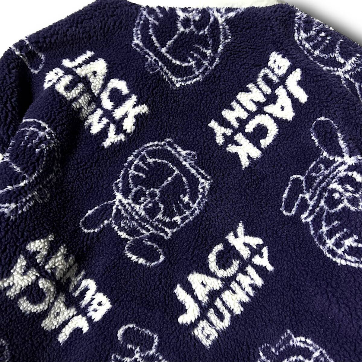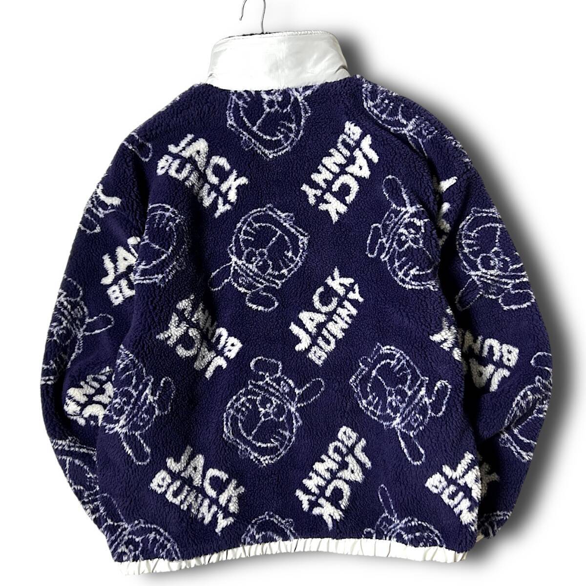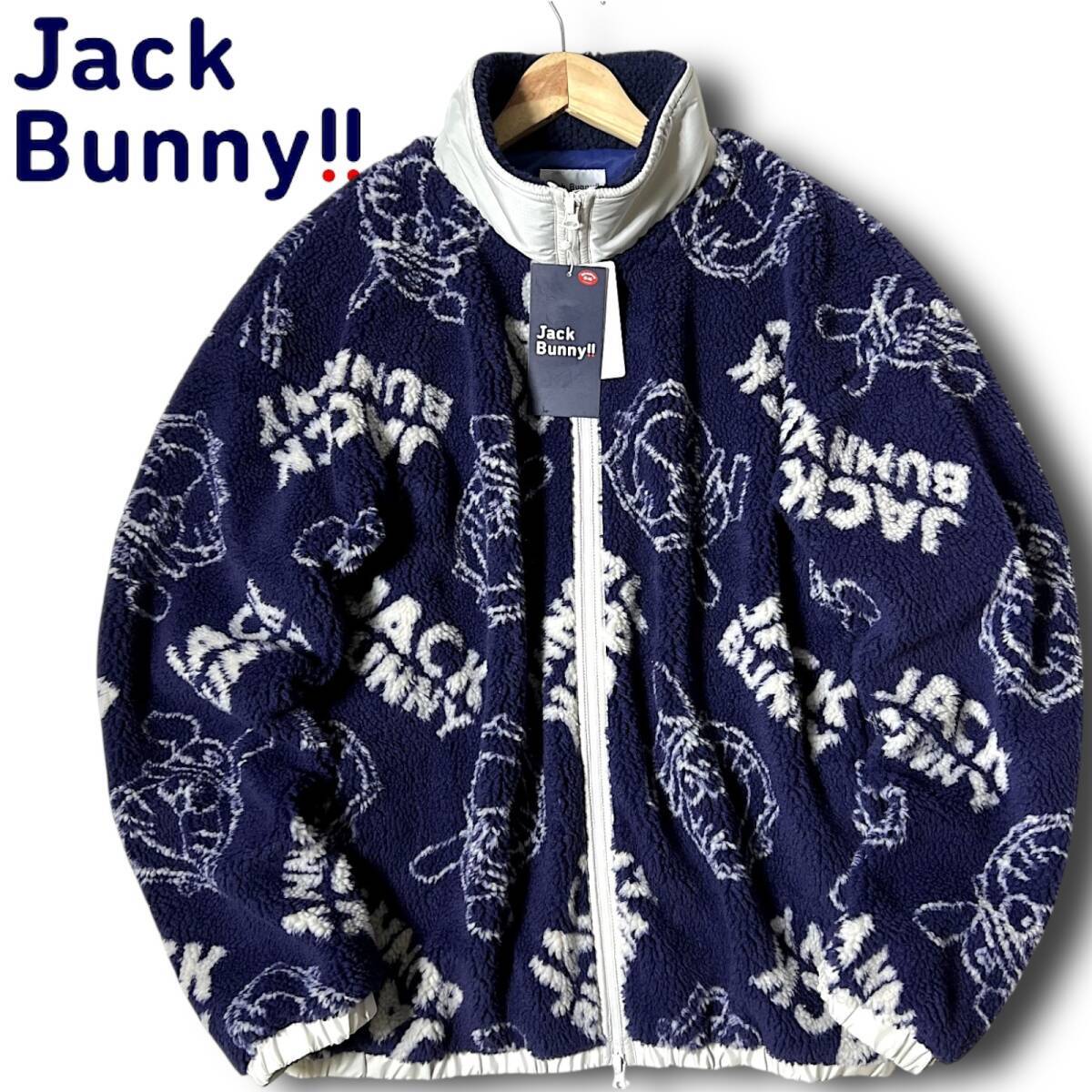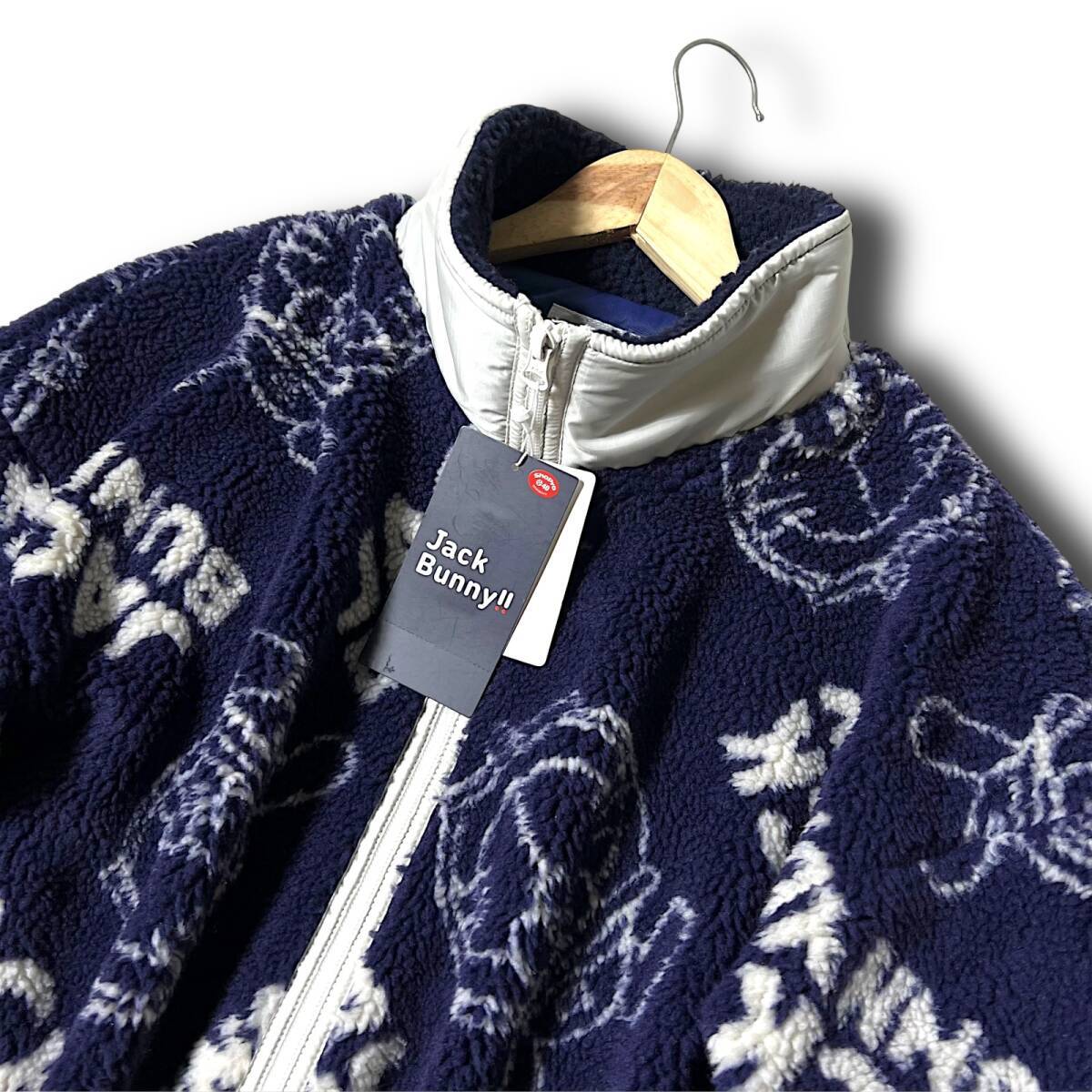タイトル 新品 Jack Bunny!! ジャックバニー パーリーゲイツ ドラえもん 防風 防寒 保温 起毛 ビッグロゴ総柄 フルジップ ダブルジップ ハイネック ボアフリースジャケット ボアジャケット ブルゾン ゴルフウェア 4 M 相当 メンズ GOLF スポーツ レジャー 普段使い タウンユース カジュアル 秋冬 AW FW 120 ネイビー系