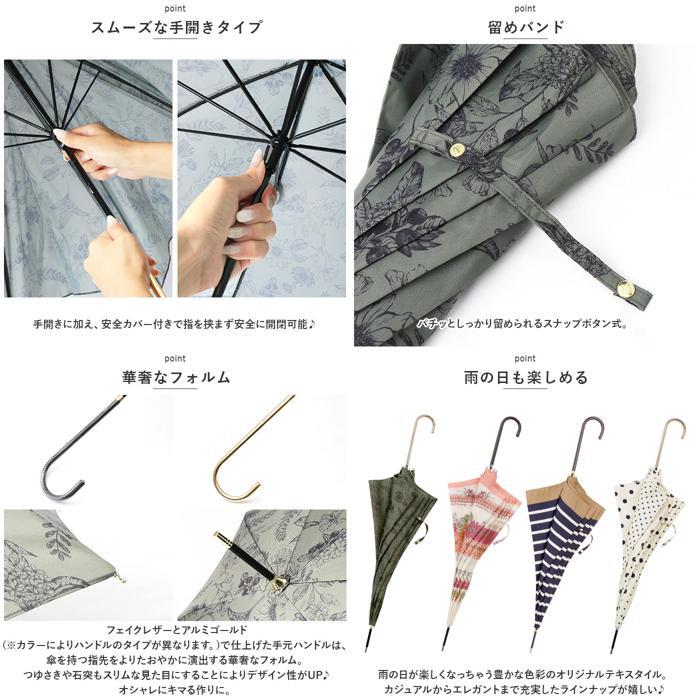 | 商品説明 | ・・オシャレなデザインで雨の日も楽しく♪晴雨兼用ロングアンブレラが発売♪(親骨58cm) ・【晴雨兼用】 ・紫外線カット率約80%以上でオールシーズン・晴れの日も使えるアイテム! ・【スムーズな手開きタイプ】 ・手開きに加え、安全カバー付きで指を挟まず安全に開閉可能♪ ・【留めバンド】 ・パチッとしっかり留められるスナップボタン式。 ・【華奢なフォルム】 ・フェイクレザーとアルミゴールド(※カラーによりハンドルのタイプが異なります。)で仕上げた手元ハンドルは、傘を持つ指先をよりたおやかに演出する華奢なフォルム。 ・つゆさきや石突もスリムな見た目にすることによりデザイン性がUP♪オシャレにキマる作りに。 ・【雨の日も楽しめる】 ・雨の日が楽しくなっちゃう豊かな色彩のオリジナルテキスタイル。カジュアルからエレガントまで充実したラインナップが嬉しい♪ |